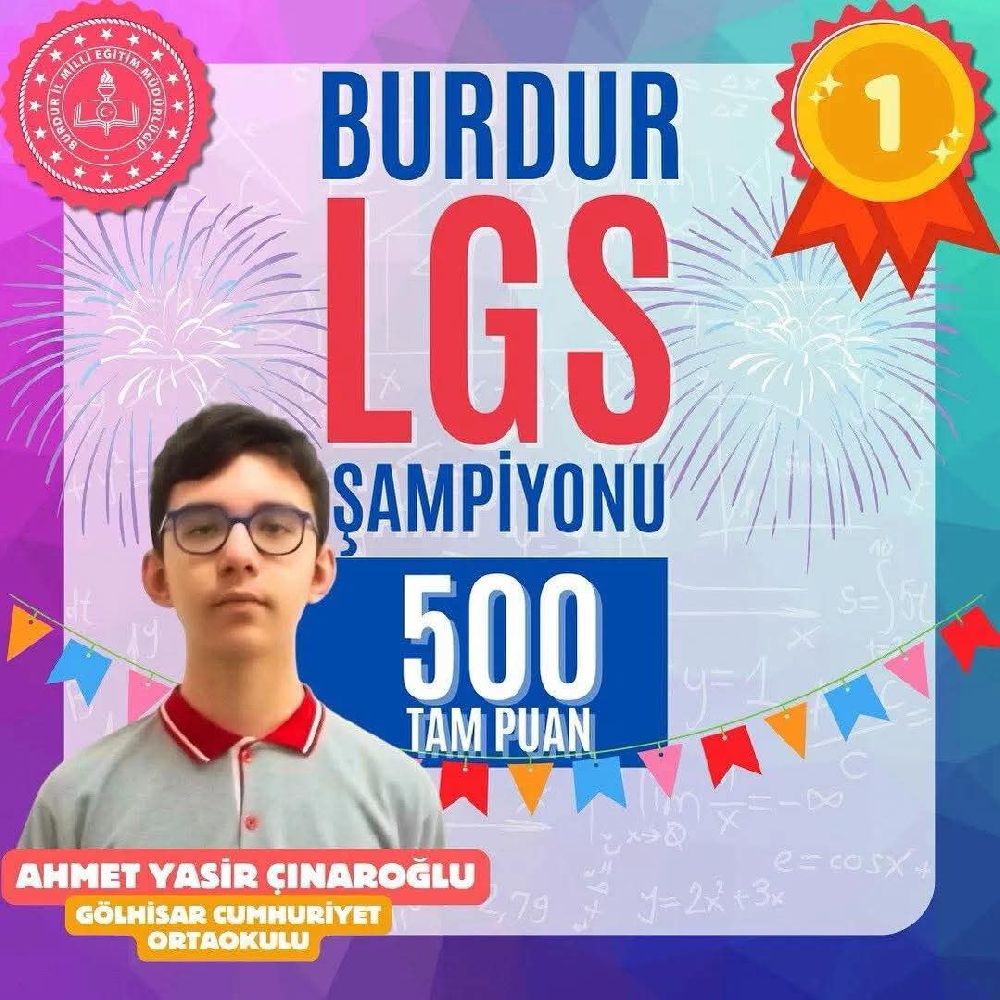 500 tam puanla Türkiye genelinde en üst başarıyı yakalayan Ahmet Yasir Çınaroğlu, Gölhisar Cumhuriyet Ortaokulu’nun ve Burdur’un adını Türkiye genelinde duyurmayı başardı. Eğitim camiası ve sosyal medyada da genç öğrenciye tebrik mesajları yağdı.