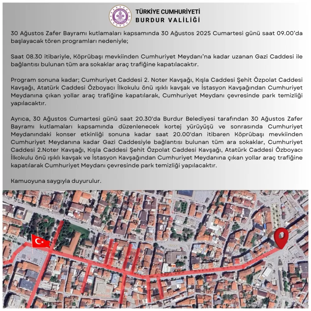 Valilikten yapılan açıklamaya göre, 30 Ağustos 2025 Cumartesi günü saat 09.00’da başlayacak tören programları öncesinde, saat 08.30’dan itibaren Köprübaşı mevkiinden Cumhuriyet Meydanı’na kadar uzanan Gazi Caddesi ile bu caddeye bağlantısı bulunan tüm ara sokaklar araç trafiğine kapatılacak.