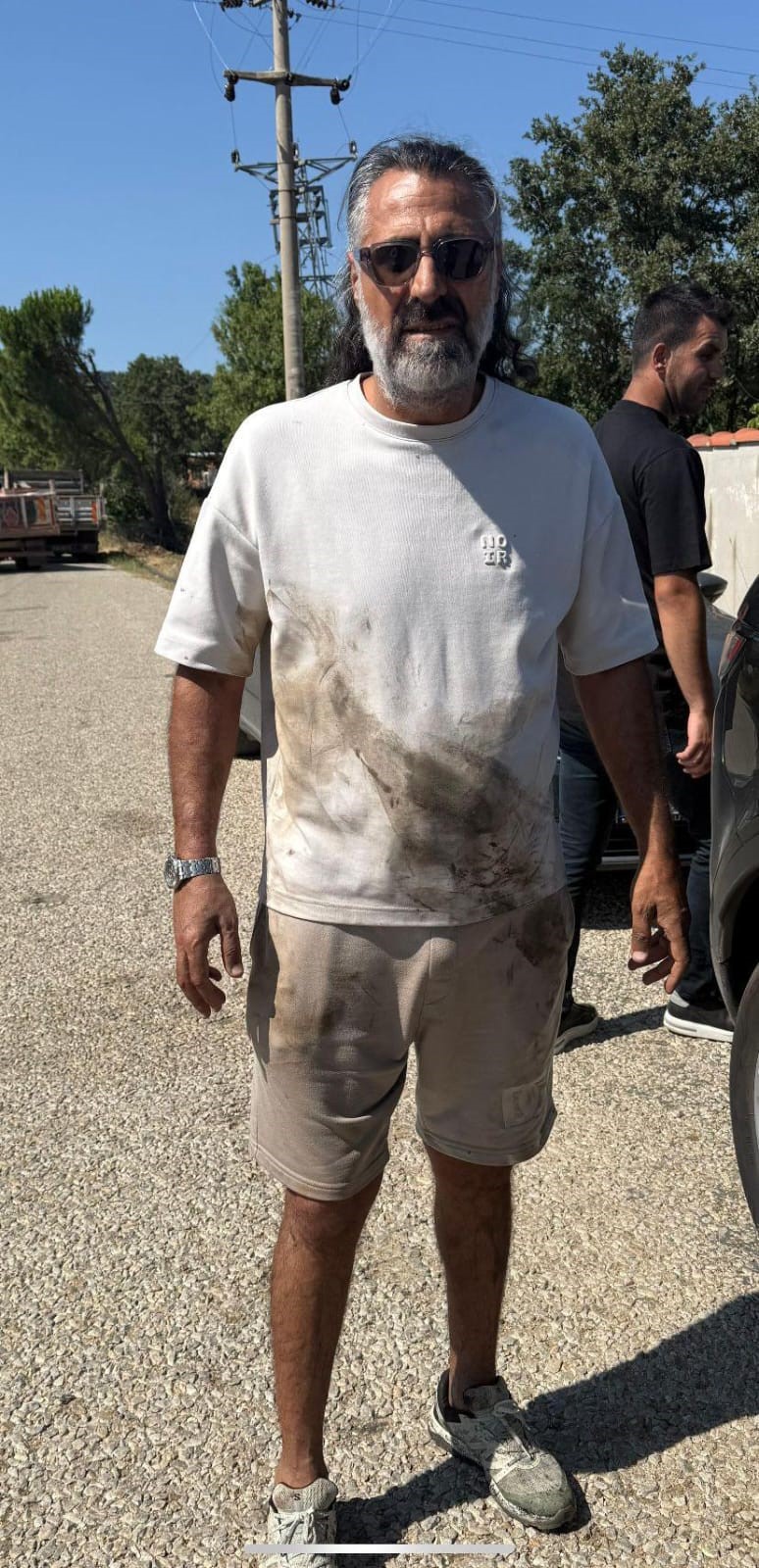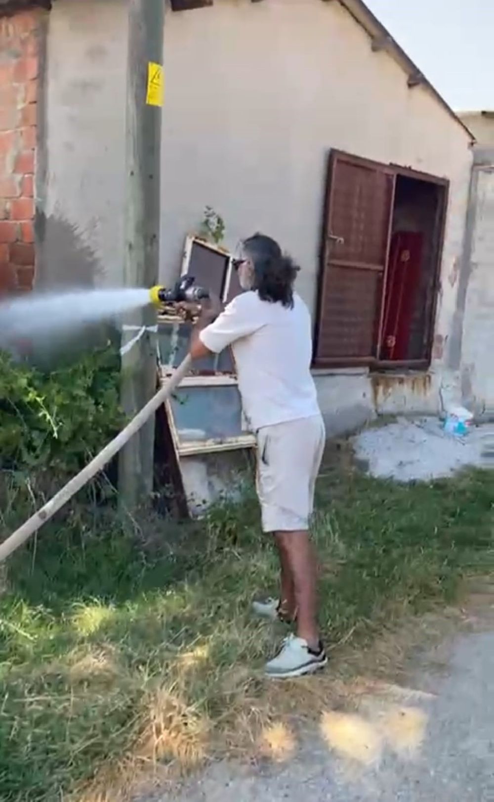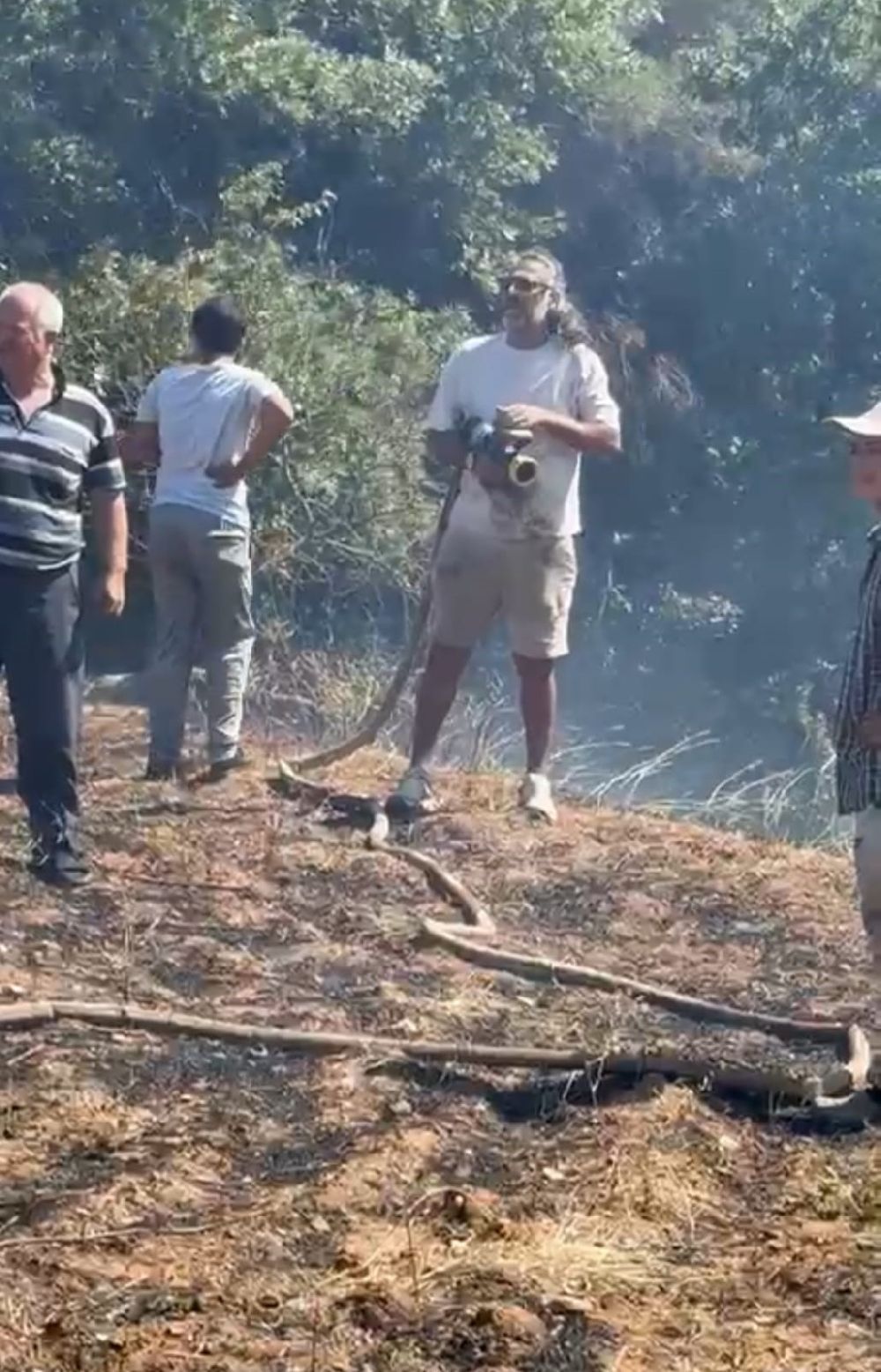 Çanakkale'de bir evin bahçesinde çıkan yangını söndürme çalışmalarına ünlü oyuncu Kenan Çoban da destek verdi.
