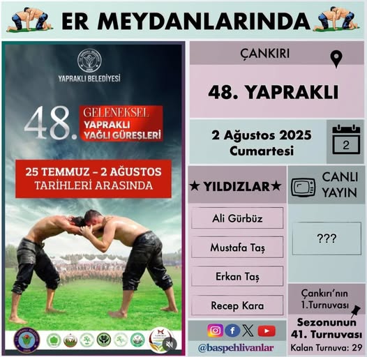 Yağlı güreş sezonunun 41. organizasyonu olan 48. Yapraklı Yağlı Güreşleri, 2 Ağustos 2025 Cumartesi günü Çankırı’nın Yapraklı ilçesinde gerçekleştirilecek.