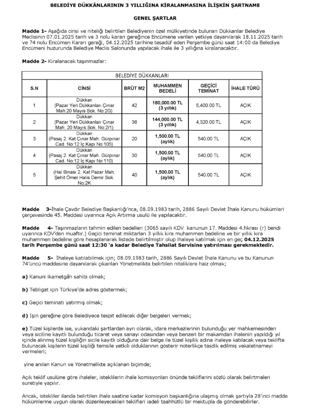 Çavdır Belediyesi, belediye mülkiyetinde bulunan bazı dükkanların 3 yıllığına kiralanması için ihale yapılacağını duyurdu. Açıklamaya göre ihale, 04.12.2025 Perşembe günü saat 14.00’te Belediye Encümeni huzurunda, Belediye Meclis Salonunda gerçekleştirilecek.