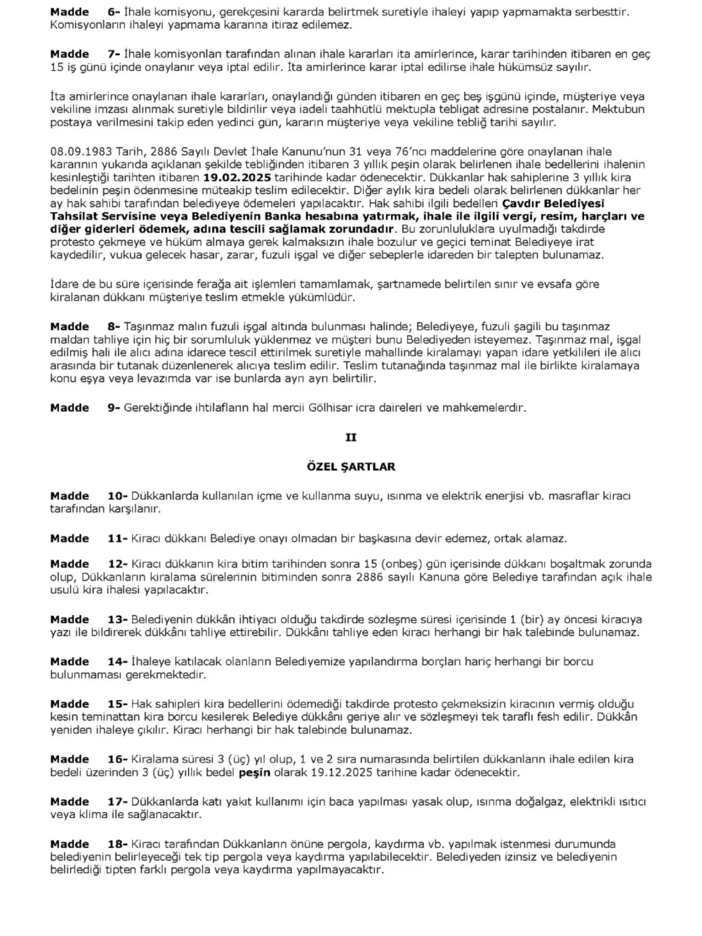 Açıklamada, 3 yıllık peşin ödenecek ihale bedellerinin, ihalenin kesinleştiği tarihten itibaren 19.02.2025 tarihine kadar yatırılması gerektiği belirtildi. Dükkanların, kira bedelinin peşin ödenmesinin ardından hak sahiplerine teslim edileceği ifade edildi.