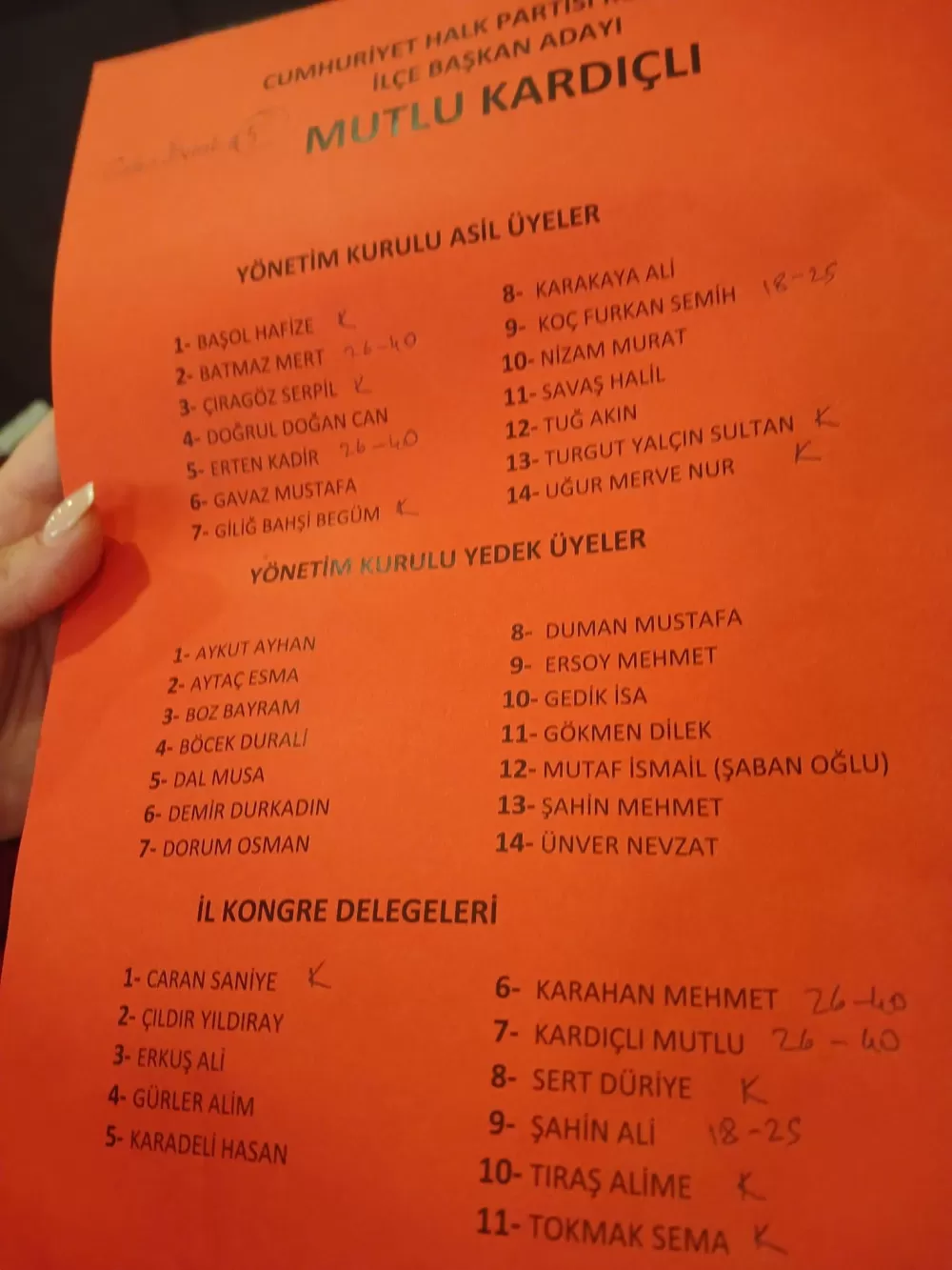 Kırmızı Liste ile seçime katılan Mutlu Kardıçlı ise yönetim kurulunda Hafize Başol, Mert Batmaz, Serpil Çıragöz, Doğan Can Doğrul, Kadir Erten, Mustafa Gavaz, Begüm Gilig Bahşi, Ali Karakaya, Furkan Semih Koç, Murat Nizam, Halil Savaş, Akın Tuğ, Sultan Yalçın Turgut ve Merve Nur Uğur isimlerine yer verdi. Kırmızı listenin il kongresi delegeleri arasında Saniye Caran, Yıldıray Çıldır, Ali Erkuş, Alim Gürler, Hasan Karadeli ve Mutlu Kardıçlı öne çıkıyor.