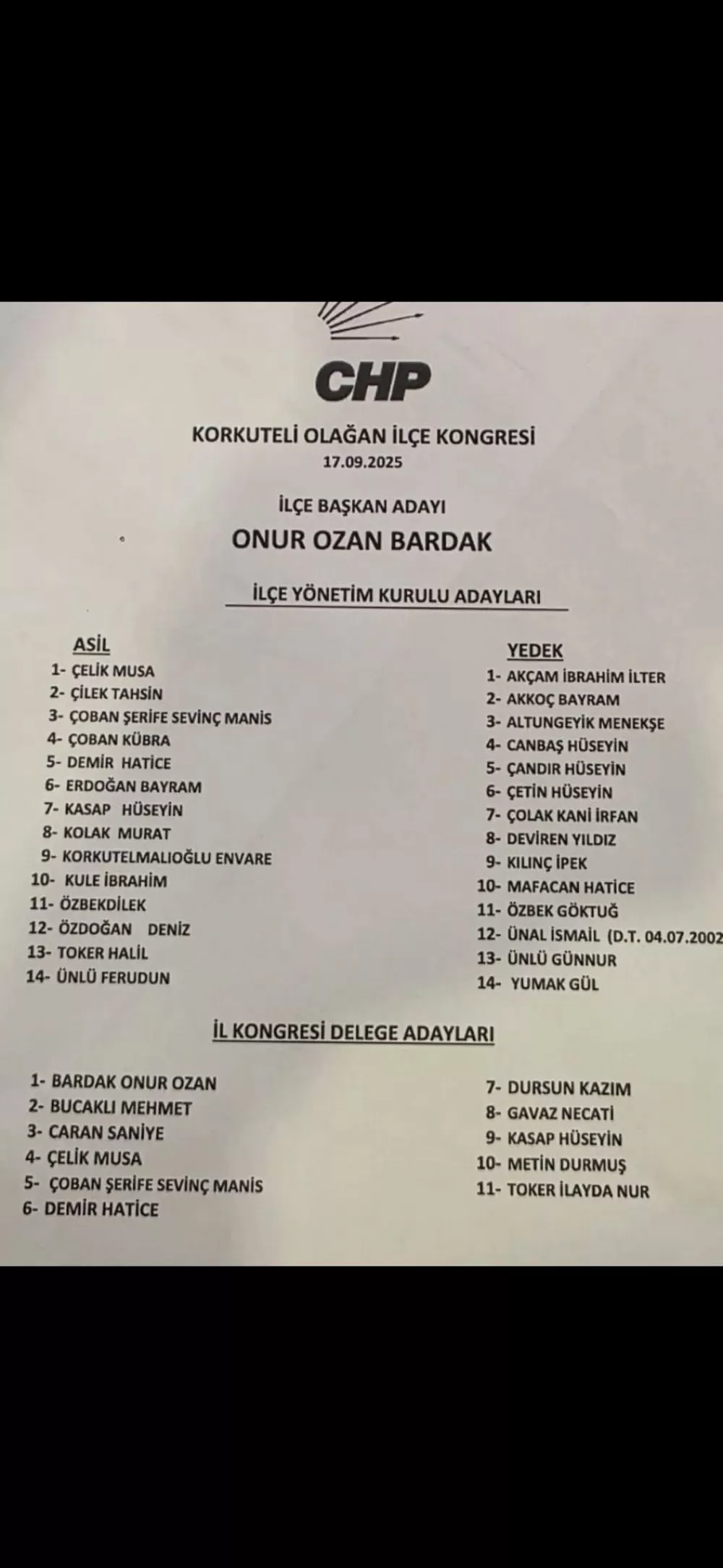 Cumhuriyet Halk Partisi (CHP) Korkuteli İlçe Kongresi, ilçedeki siyasi gündemi adeta ateşledi. Beyaz Liste’nin başında Onur Ozan Bardak, Kırmızı Liste’nin liderliğinde ise Mutlu Kardıçlı yer alıyor. Parti üyeleri, uzun süredir beklenen kongrede hangi listenin ipi göğüsleyeceğini merakla bekliyor.