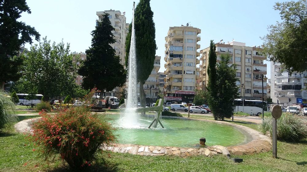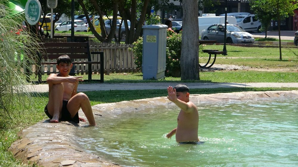 Antalya'da sıcaktan bunalan çocuklar tehlikeye rağmen parklarda bulunan süs havuzlarında serinlemeye çalıştı.
