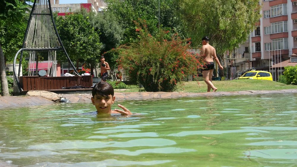 Süs havuzuna arkadaşları ile birlikte girerek serinlemeye çalışan Eren Aras isimli küçük çocuk "Deniz uzak hava çok sıcaktı serinlemek için buraya geldik, yüzüyoruz. Adanalı Memocan'a buradan meydan okuyorum" dedi.