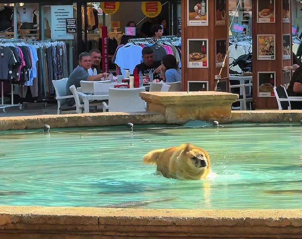 Antalya'nın yaya yoğunluğunun en fazla olduğu Kazım Özalp Caddesi'nde (Kapalıyol) sıcaktan bunalan bir sokak köpeği de süs havuzuna girerek serinlemeye çalıştı. O anlar cep telefonu kamerasına yansıdı.