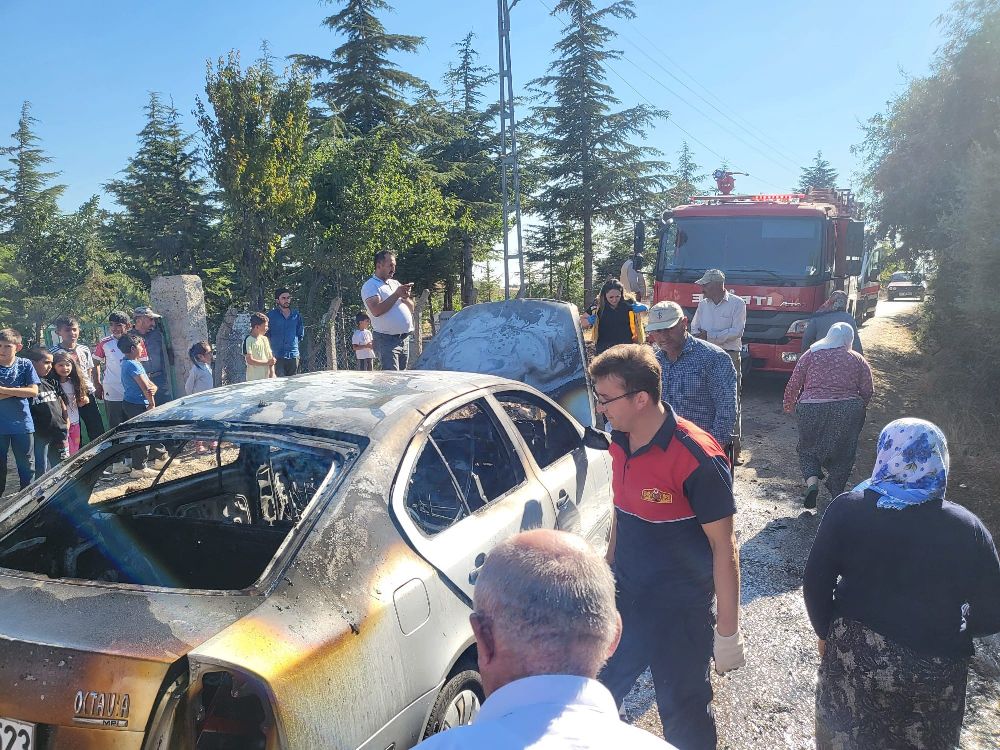 Çorum'un Sungurlu ilçesinde köy mezarlığı önünde park halindeki otomobil alev alev yandı.
