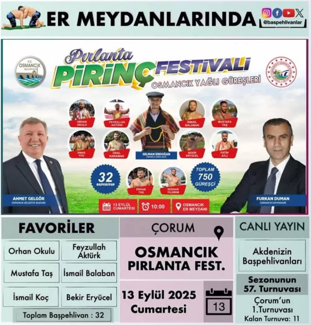 Çorum'da güreş rüzgarı esiyor! Bölgenin en önemli festivallerinden biri olan Osmancık Pırlanta Pirinç Festivali kapsamında düzenlenen yağlı güreşler,13 mayıs 2025 cumartesi bugün itibarıyla başladı. Sezonun 57. güreşi olma özelliğini taşıyan bu önemli turnuva, güreş severler tarafından büyük bir ilgiyle takip ediliyor.