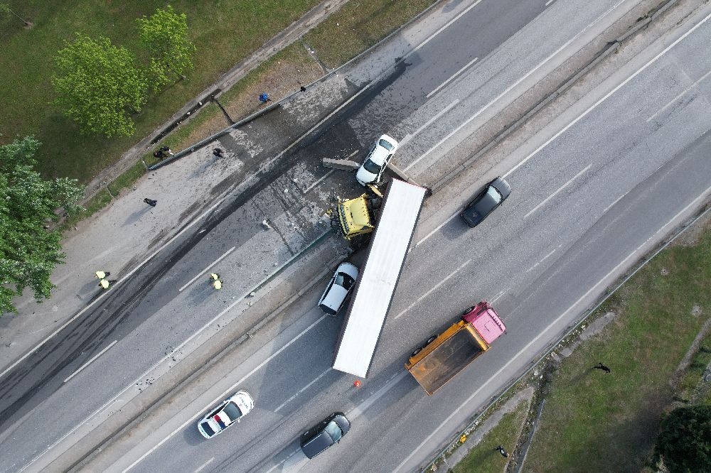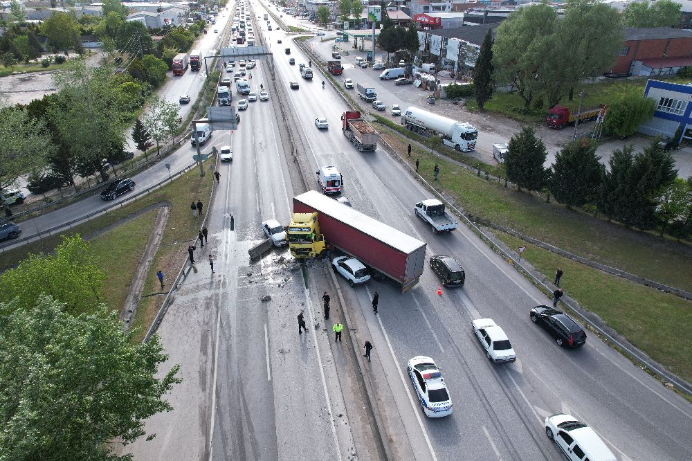 Sakarya'nın Arifiye ilçesi D-100 karayolunda kontrolden çıkarak bariyerleri aşan tır karşı şeride geçti. 4 aracın karıştığı zincirleme trafik kazasında ortalık adeta savaş alanına döndü. Kazada 1 kişi hafif şekilde yaralanırken, bölgede oluşan trafik dron ile görüntülendi.