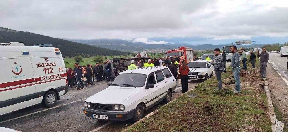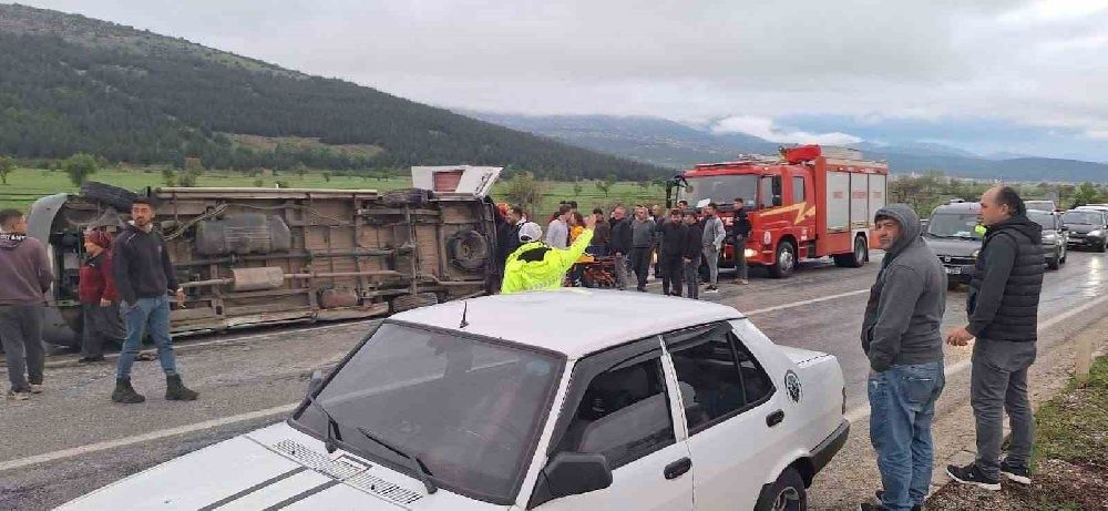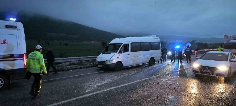 Denizli’nin Tavas ilçesinde tekstil işçilerini taşıyan minibüs, kontrolden çıkması sonucu refüjü aşarak karşı şeritteki seyir halinde olan otomobil ile çarpıştı. Çarpışma sonucu minibüs devrilirken, 1’i ağır 13 kişi yaralandı.