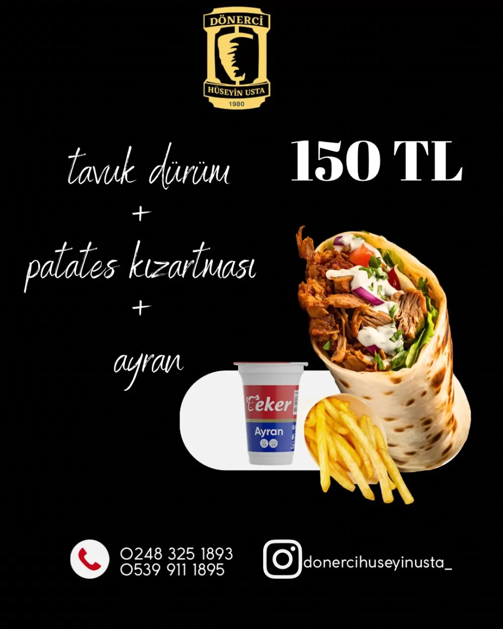 Burdur'un Bucak ilçesinde tavuk döner, pilav üstü, dürüm, gobit ekmeği, pide çeşitleri ve lahmacun gibi lezzetleri sizlere sunan Dönerci Hüseyin Usta, yeni kampanyasıyla müşterilerine hizmet veriyor.