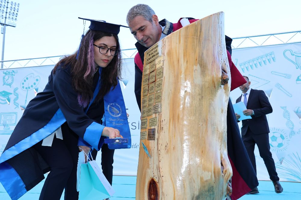 Mezuniyet Töreninde konuşan Tıp Fakültesi dönem birincisi Yekta Başak Nizamoğlu, "Bugün; temposu en yüksek, yoğunluğu ve sorumluluğu en fazla mesleklerden biri olan, hekimliğe giriş yapmamızı kutlamak amacıyla toplandık. Zorluğu fazla olmasıyla beraber, manevi tatmini de yüksek olan, insanlara şifa dağıtma ayrıcalığına sahip olduğumuz bu mesleğin bir parçası olmaktan gurur duyuyorum" sözleriyle duygularını dile getirdi.