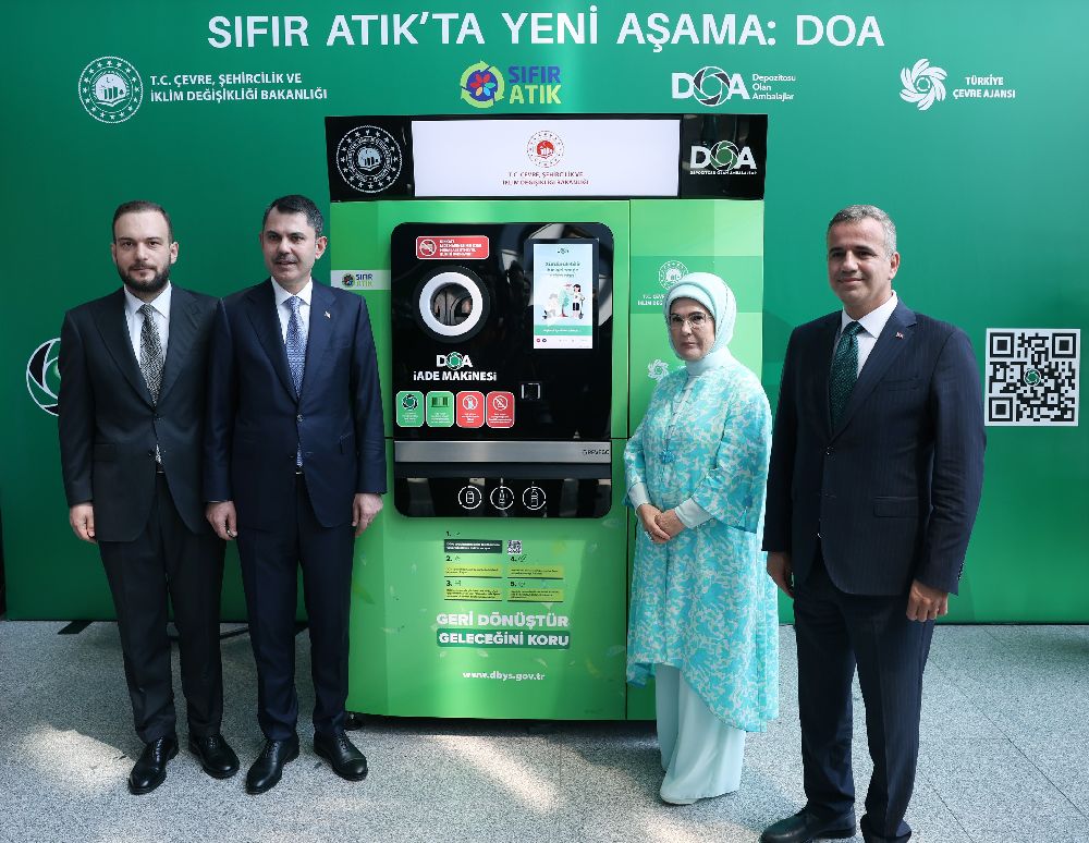 Emine Erdoğan daha sonra, alandaki Çevre, Şehircilik ve İklim Değişikliği Bakanlığı bünyesindeki Türkiye Çevre Ajansı (TÜÇA) tarafından yürütülen proje kapsamında yerli ve milli imkanlarla üretilen Depozitosu Olan Ambalajlar (DOA) makinesini inceledi.