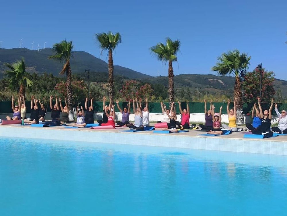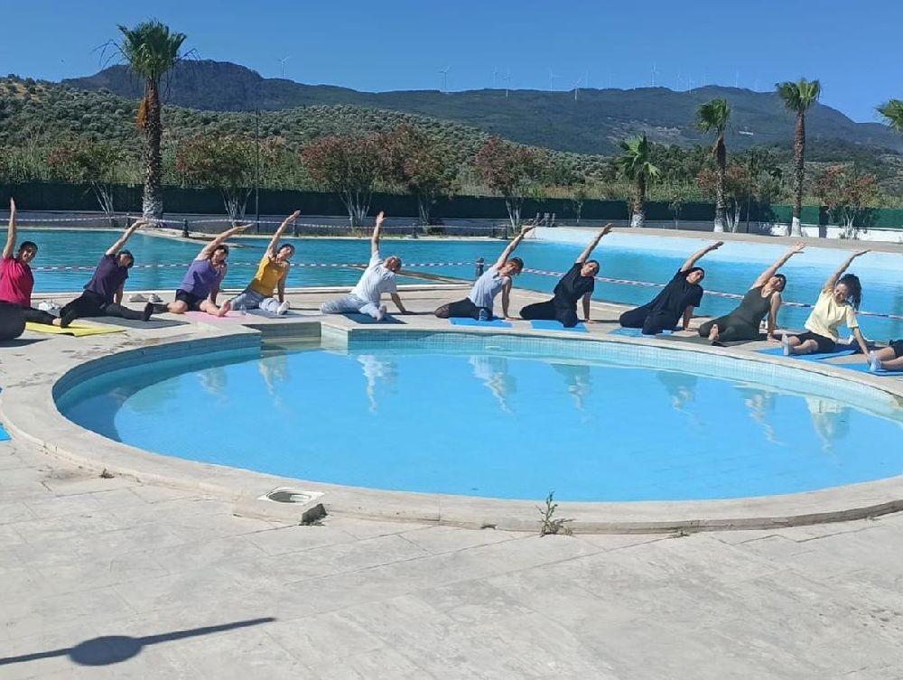 Germencik Belediyesi tarafından düzenlenen yoga, pilates ve zumba kurslarına yoğun ilgi gösteren kadınlar, uzman eğitmenler eşliğinde havuz başında spor yapma imkanı buluyor.