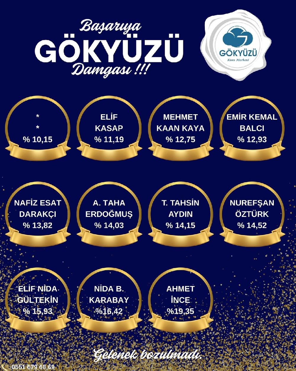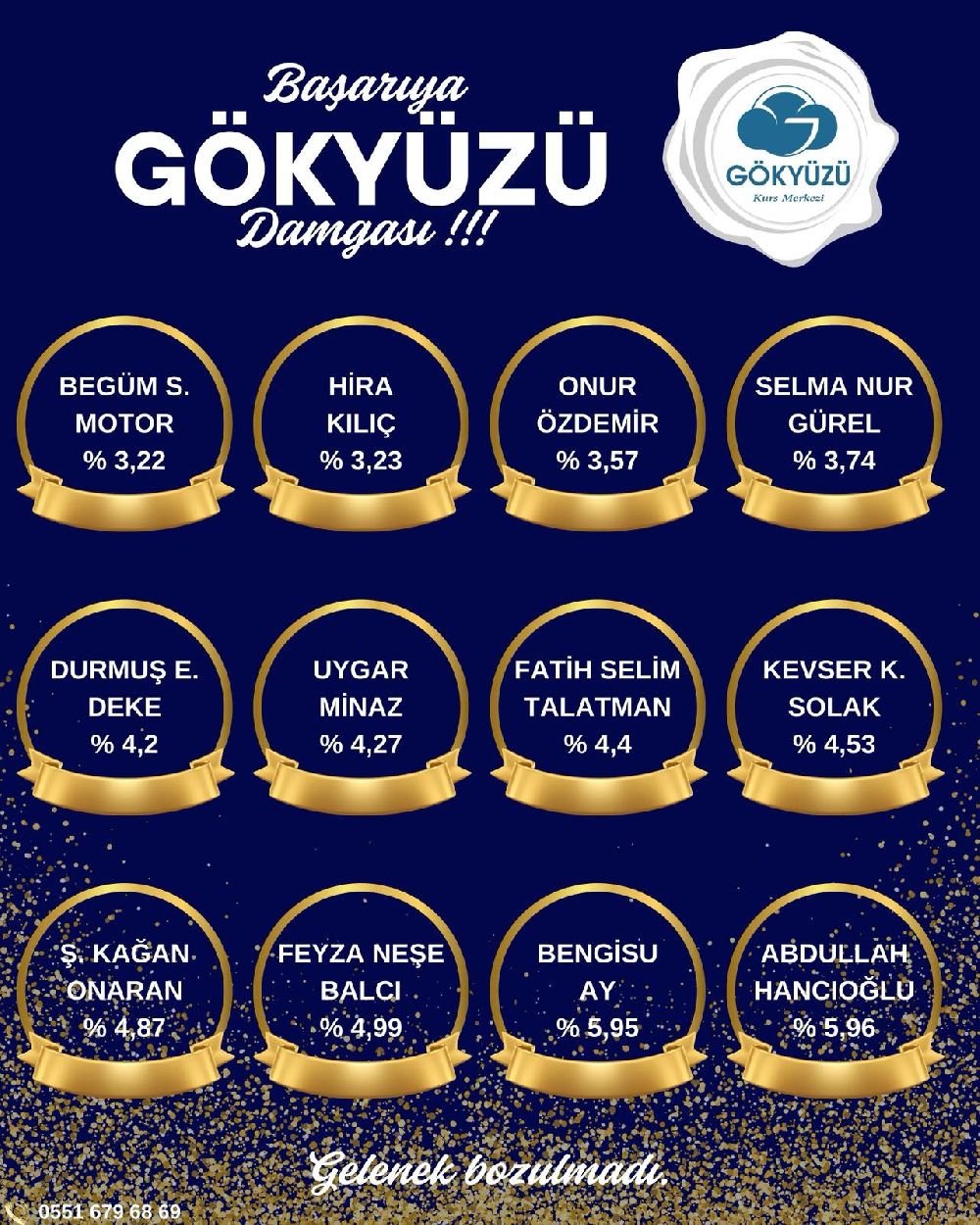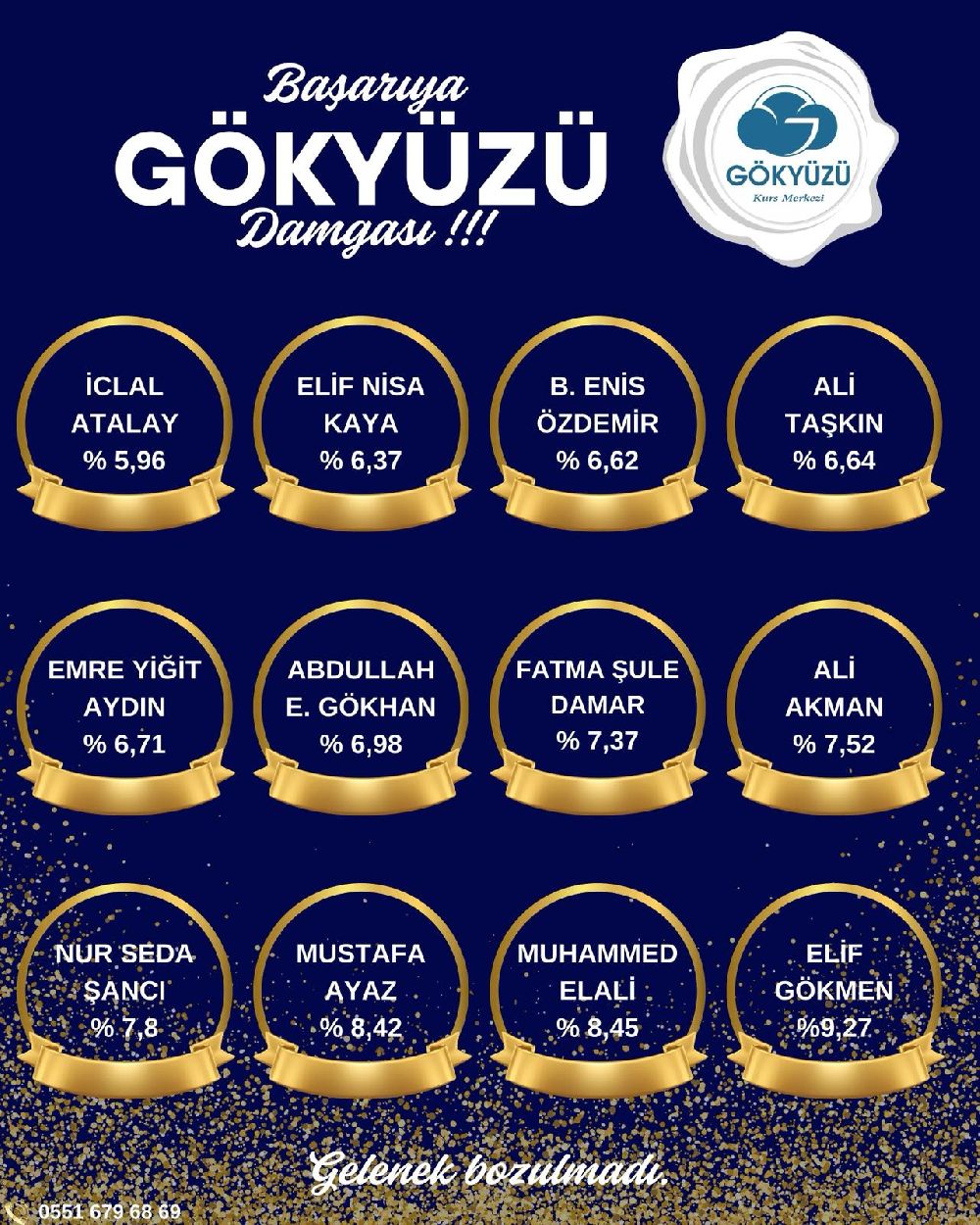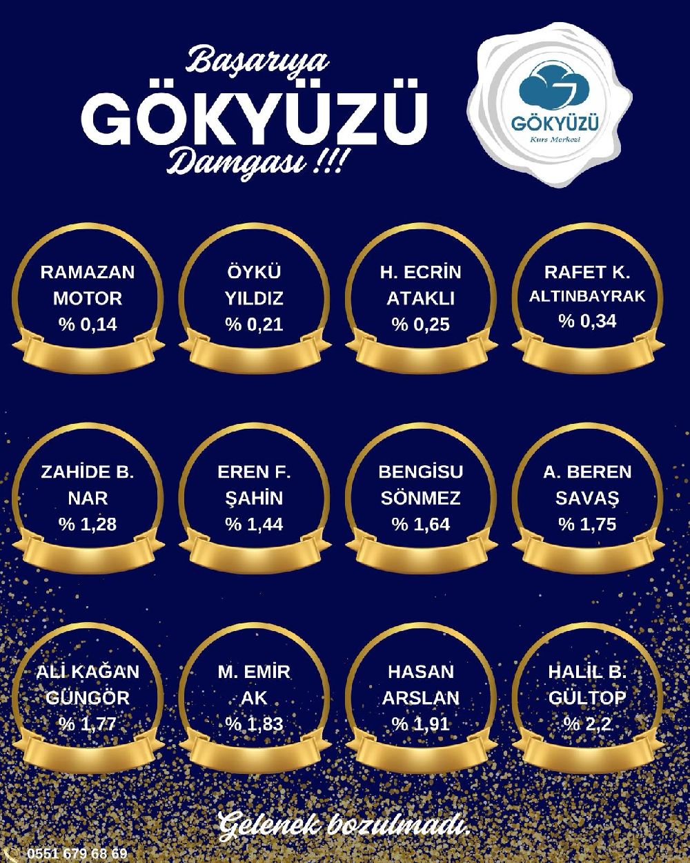 Gökyüzü Kurs Merkezi olarak başarı tesadüf değil, disiplinli çalışmanın ürünüdür. Başarıya giden bu yolda emeği geçen tüm öğrencilerimizi ve öğretmenlerimizi gönülden tebrik ediyoruz.