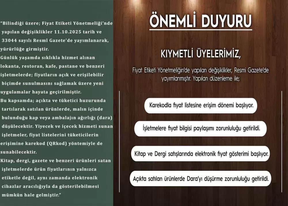 "Bilindiği üzere; Fiyat Etiketi Yönetmeliği’nde yapılan değişiklikler 11.10.2025 tarih ve 33044 sayılı Resmî Gazete’de yayımlanarak, yürürlüğe girmiştir.