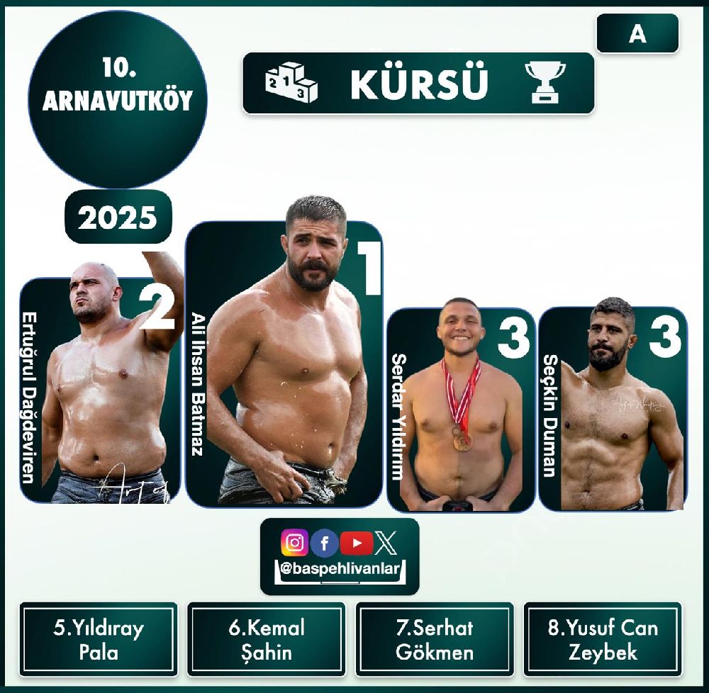 İstanbul’un Arnavutköy ilçesi, bu yıl 10’uncusu düzenlenen Yağlı Güreşler organizasyonuna ev sahipliği yaptı. 2 Ağustos 2025 cumartesi yapılan Güreşseverlerin yoğun ilgi gösterdiği etkinlikte, Türkiye'nin dört bir yanından gelen başpehlivanlar kıyasıya mücadele etti. Gün boyu süren kıran kırana karşılaşmalar sonunda, finalde rakibi Ertuğrul Dağdeviren’i mağlup eden Ali İhsan Batmaz, 10. Arnavutköy Yağlı Güreşleri'nin başpehlivanı oldu.