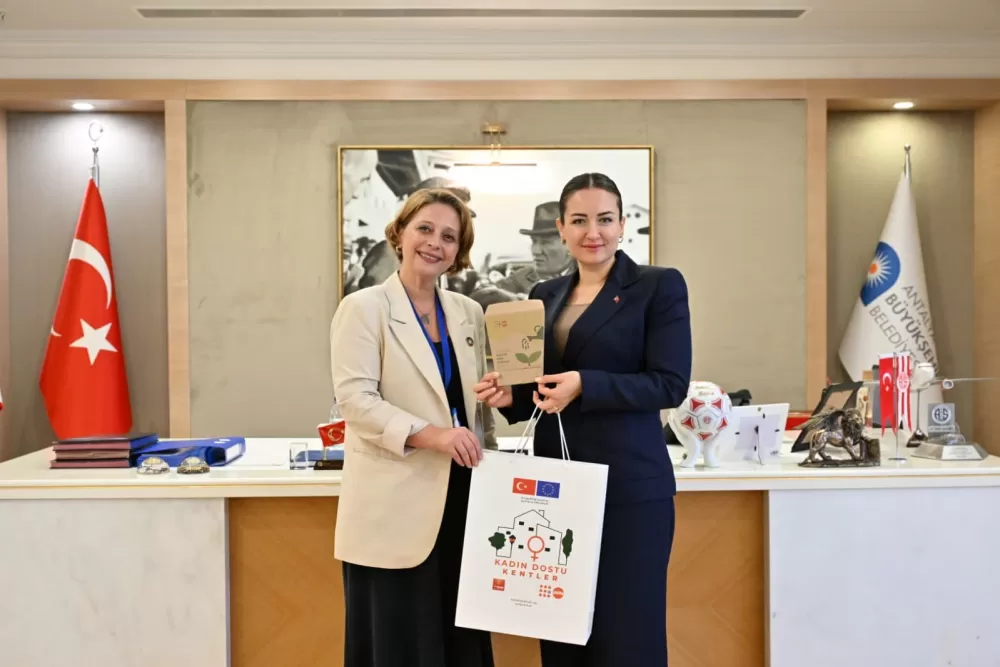 Antalya Büyükşehir Belediyesi, Dışişleri Bakanlığı Avrupa Birliği Başkanlığı koordinasyonunda Avrupa Birliği’nin finansal desteği, Birleşmiş Milletler Nüfus Fonu, UNFPA’in yürütücülüğünde Türkiye Belediyeler Birliği ortaklığıyla yürütülen ‘Kadın Dostu Kentler III’ programı kapsamında çalışmalar sürüyor. Antalya Büyükşehir Belediyesi Başkan Vekili Büşra Özdemir, "Kadın Dostu Kentler III" programı kapsamında Birleşmiş Milletler Nüfus Fonu (UNFPA) yetkilileri ile bir araya geldi. UNFPA Türkiye Kadın Dostu Kentler Programı Yöneticisi Özlem Çalışkan ve Saha Koordinatörü Naz Hıdır ve heyet, Başkan Vekili Özdemir’i ziyaret ederek, yürütülen programı değerlendirdi. Kadın Dostu Kentler III Programı’na 25 pilot ilden biri olarak seçilen Antalya Büyükşehir Belediyesi’nin yaptığı çalışmaların ele alındığı ziyarette, program kapsamında 30 Kasım 2027 yılına kadar yürütülecek faaliyetler konuşuldu.