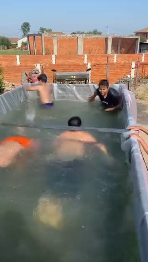 Bursa'nın Yenişehir ilçesinde sahibi olduğu kamyonun kasasını naylon ile kaplayıp içerisine su dolduran bir vatandaş kamyonu çocuklar için yüzme havuzu haline getirdi.