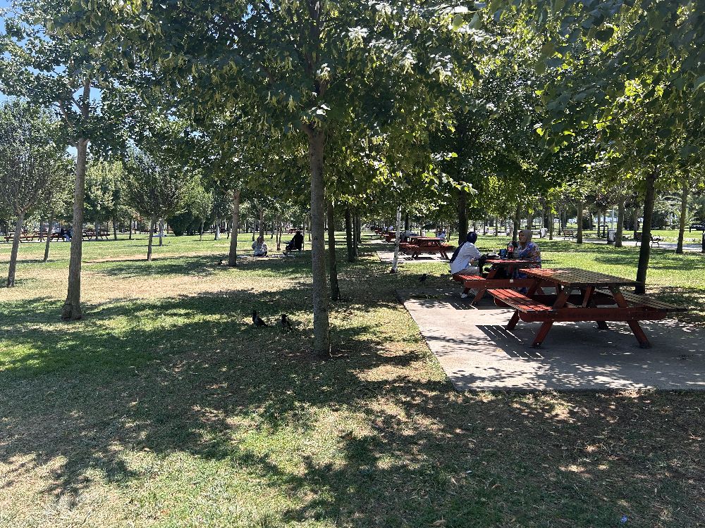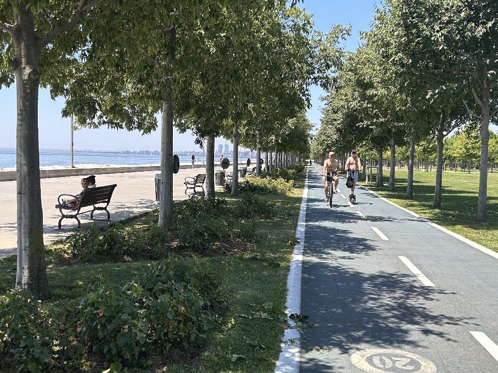 "Arkadaşla beraber oturuyoruz. Hava çok sıcak olduğu için gölgeye geldik, burada serinliyoruz. Evde çok sıkılmıştık, sahilin sessiz sakin olması iyi oldu. Gölge bile sıcak ama evden iyidir, evde çok bunalıyoruz. Yüzenler var ama biz yüzmedik, yoksa deniz çok güzel görünüyor."