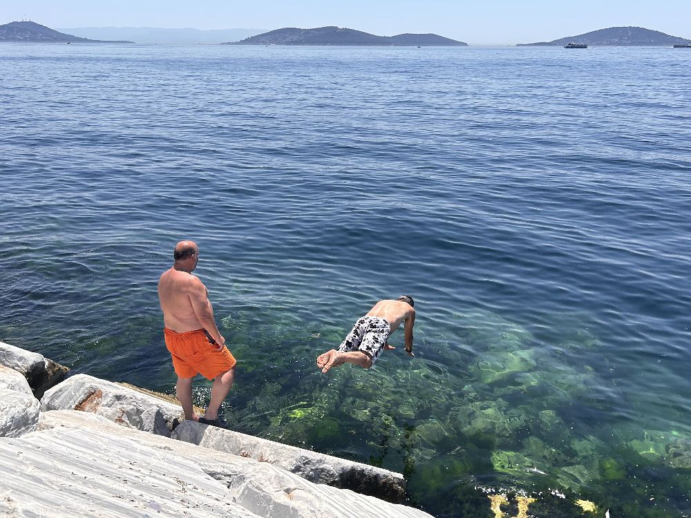 Arkadaşıyla beraber denize giren Arif Aydemir de keyifli vakit geçirdiklerini söyleyerek, "2-3 gündür uyarı yapılıyordu ‘Çöl sıcakları geliyor' diye. Biz de o yüzden bugün böyle bir etkinlik yaptık. Genelde Sarayburnu'nda yüzüyoruz ama buraya da sık geliyoruz. İş yerimiz burada olduğu için buradan denize girmek güzel oldu. Ben bugün buranın çok kalabalık olacağını düşünmüştüm ama bizden başka yüzen kimse yok. Biz de buranın tadını çıkarmaya bakıyoruz. Şu an çok sıcak, biraz daha sıcak olduğunda gölgeye çekiliyoruz. Hava bizi nedense hiç etkilemedi; aksine su da biraz soğuk olduğu için günü güzel geçirdik" şeklinde konuştu.