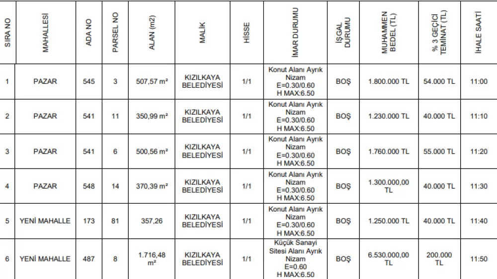 Kızılkaya Belediyesi, mülkiyeti kuruma ait imarlı ve müstakil 6 arsanın açık artırma usulüyle satışa çıkarıldığını duyurdu. Belediye Encümeninde gerçekleştirilecek ihalenin 15 Aralık 2025 Pazartesi günü saat 11.00'de yapılacağı bildirildi.
