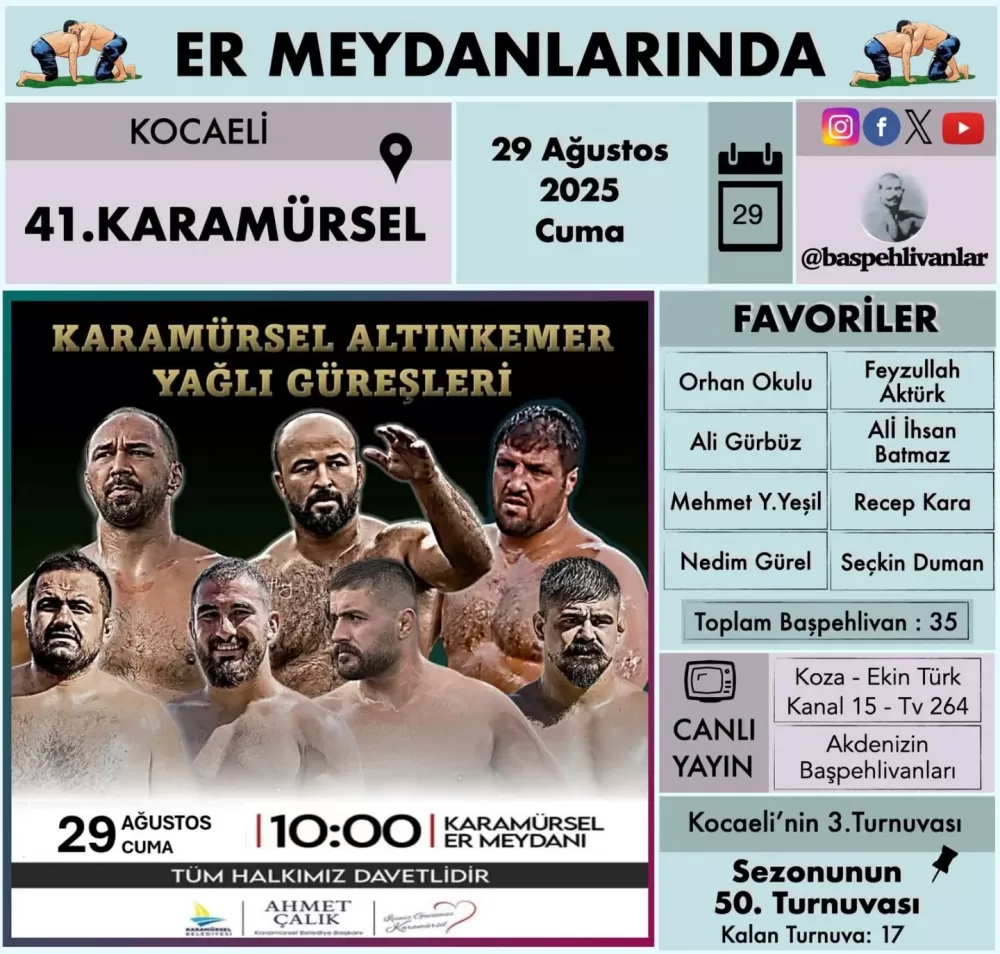Yağlı güreş sezonunun 50. organizasyonu olan 41. Karamürsel Altınkemer Yağlı Güreşleri, 29 Ağustos 2025, Cuma bugün Kocaeli'nin Karamürsel ilçesinde başlıyor. Türkiye Geleneksel Güreşler Federasyonu’nun (TGGF) güncel takvimine göre sezon sonuna sadece 17 turnuva kaldı.