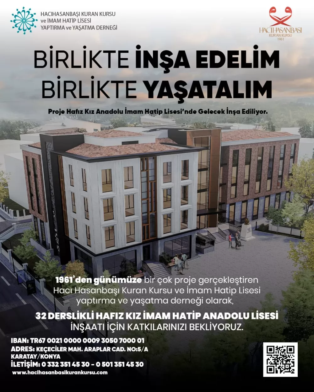 Konya’nın köklü eğitim kurumlarından Hacı Hasanbaşı Kur’an Kursu, artan talebi karşılamak ve hafızlık eğitimini güçlendirmek amacıyla kapsamlı bir yenilenme ve büyüme sürecine girdi. Kurulan Dernek çatısı altında, yeni bir Kız İmam Hatip Lisesi ve Erkek Hafız Ortaokulu projesi için düğmeye basıldı.