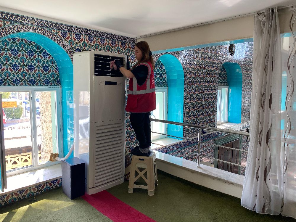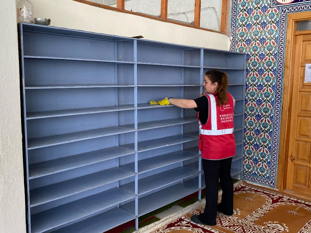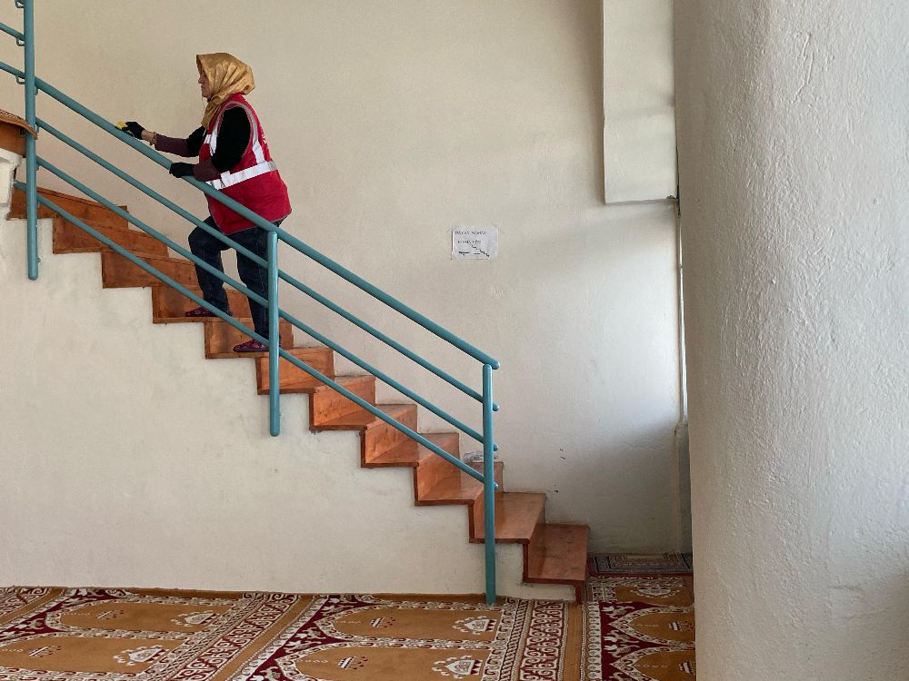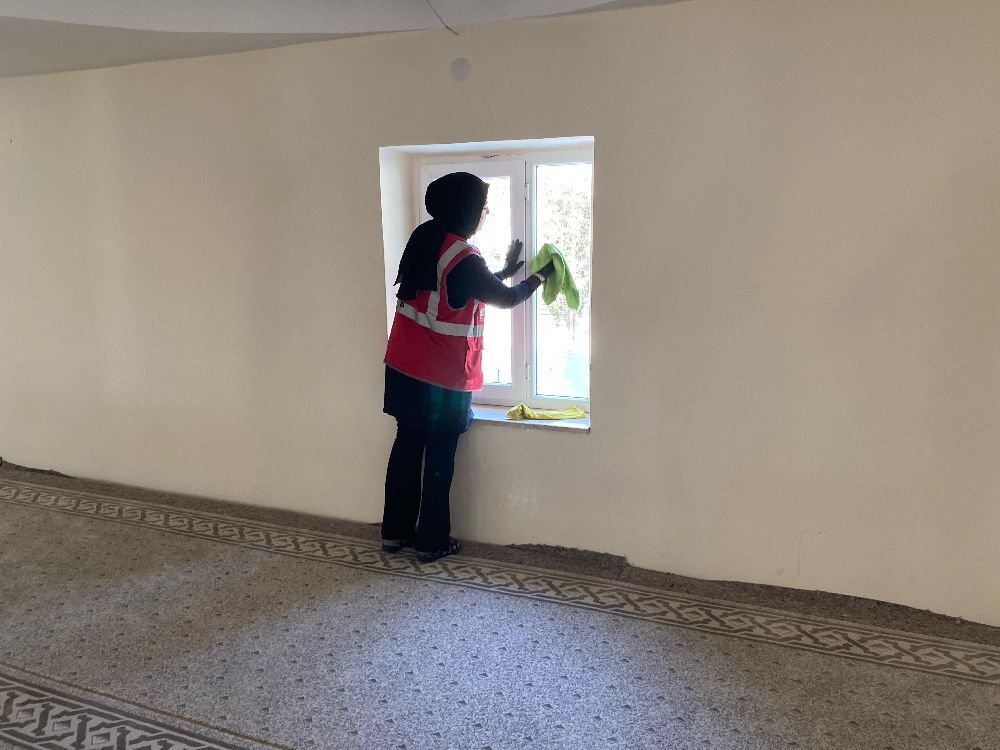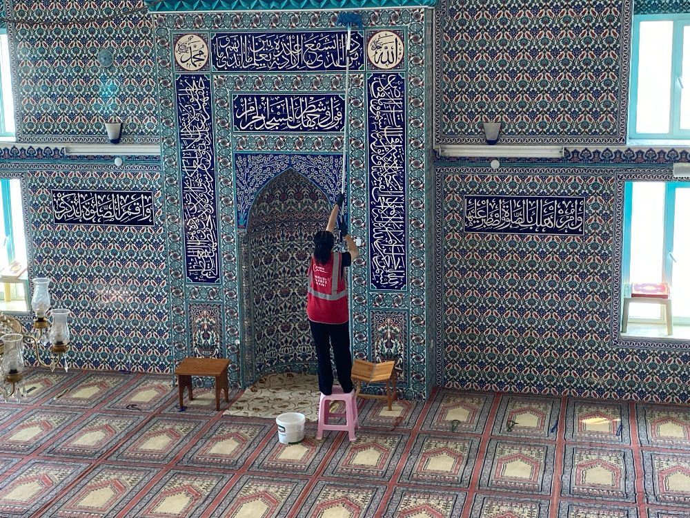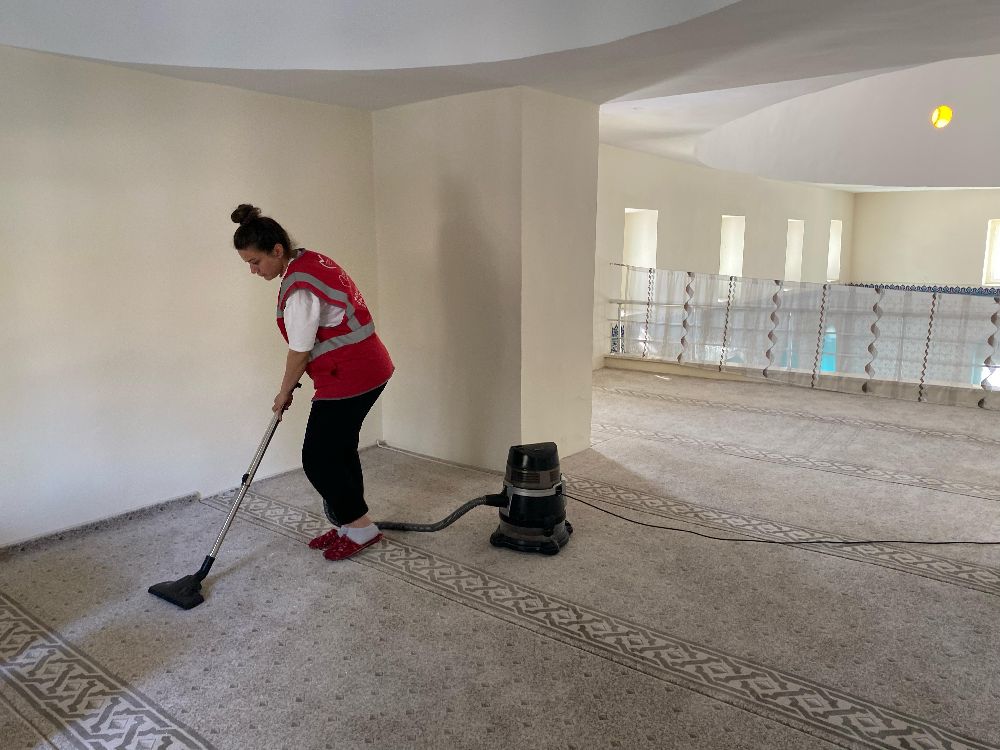Ekipler, halı süpürme ve yıkama, pencere temizliği, abdesthane ve tuvaletlerin detaylı temizliği gibi işlemleri periyodik olarak gerçekleştiriyor.