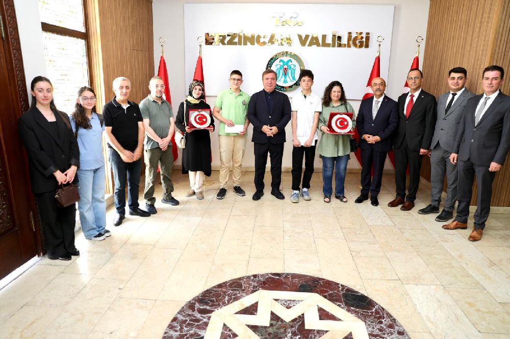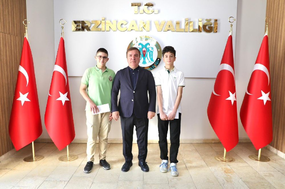 Erzincan Valisi Hamza Aydoğdu; İl Milli Eğitim Müdürü Hacı Ömer Kartal'ı, 2025 LGS'de tüm soruları doğru yanıtlayarak 500 tam puanla Türkiye birincisi olan öğrenciler Mustafa Selim Kağan ve Kaan Ölmez'i, ailelerini ve okul yöneticilerini makamında kabul etti.