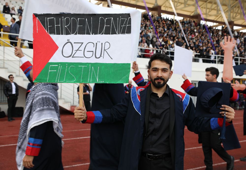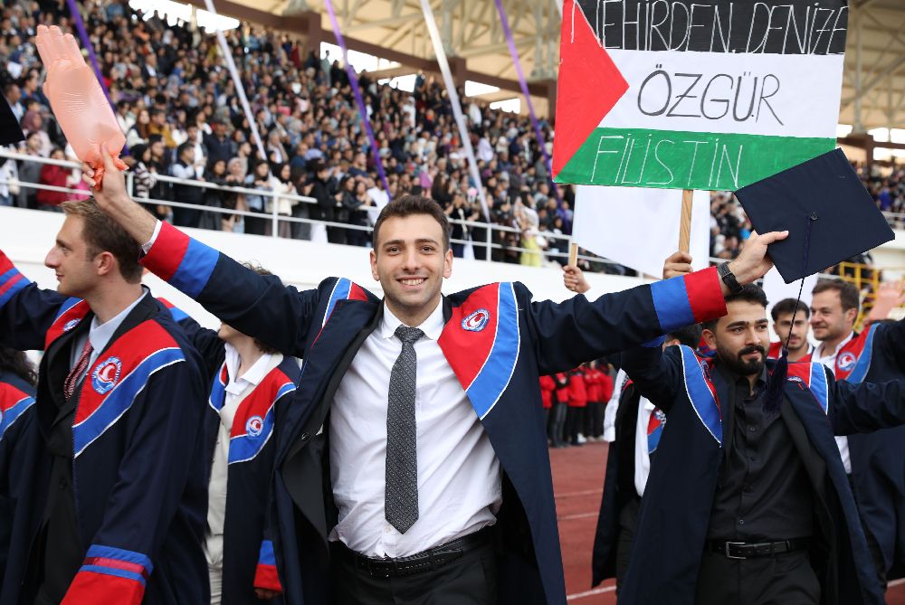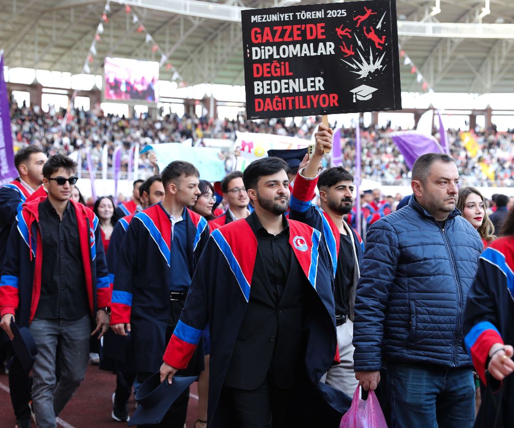 2024-2025 Eğitim Öğretim Yılı Mezuniyet Töreni, yalnızca bir veda değil, aynı zamanda güçlü bir dayanışma mesajının verildiği anlamlı bir güne sahne oldu. Mezuniyet coşkusunu yaşarken toplumsal duyarlılığı da unutmayan öğrenciler, dünyanın farklı coğrafyalarında yaşanan acılara kayıtsız kalmadıklarını gösterdi. Tören alanına ellerinde Gazze için destek mesajlarının yer aldığı dövizlerle gelen öğrenciler, Filistin halkına desteklerini sembolik bir yürüyüşle dile getirdiler.