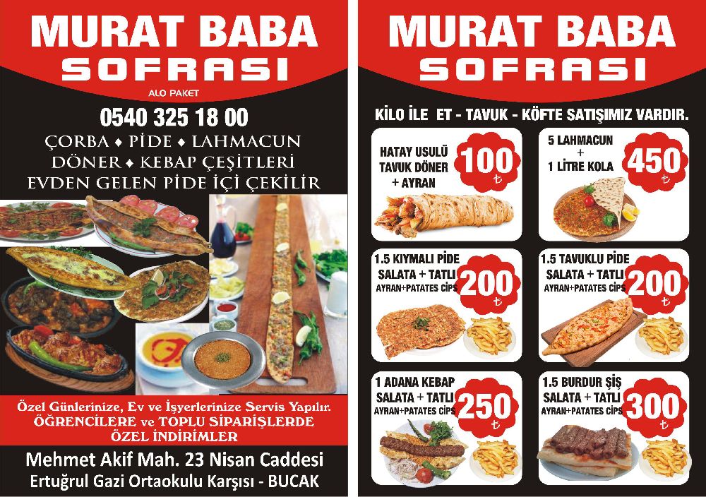 Murat Baba Sofrası, çorba, pide, lahmacun, döner ve kebap çeşitleriyle Bucak halkına zengin bir menü sunuyor. Üstelik sadece restoranda değil; evinizde ya da işyerinizde de bu eşsiz tatları deneyimleyebilirsiniz. Özel günler için paket servis imkanı ile de hizmet veren Murat Baba Sofrası, dilerseniz gel-al paket servisten yararlanabilir ya da Alo Paket hattı üzerinden siparişinizi kolayca verebilirsiniz.