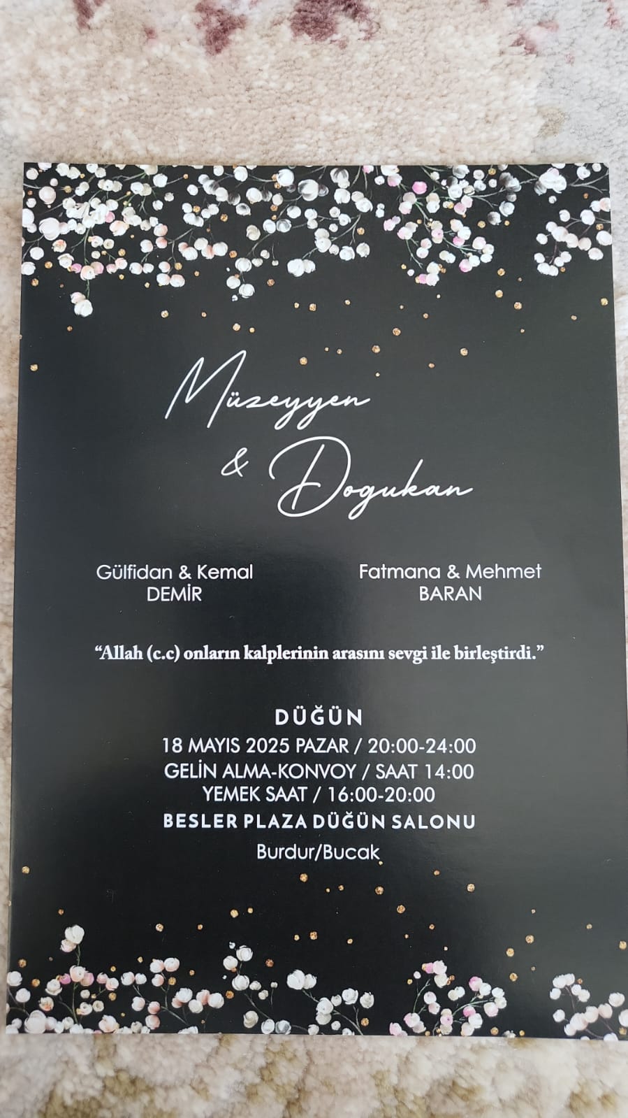 Gülfidan & Kemal DEMİR çiftinin değerli kızı Müzeyyen ile Fatmana & Mehmet BARAN çiftinin kıymetli oğlu Doğukan, 18 Mayıs 2025 Pazar günü yapılacak muhteşem bir düğün ile dünya evine girecekler.