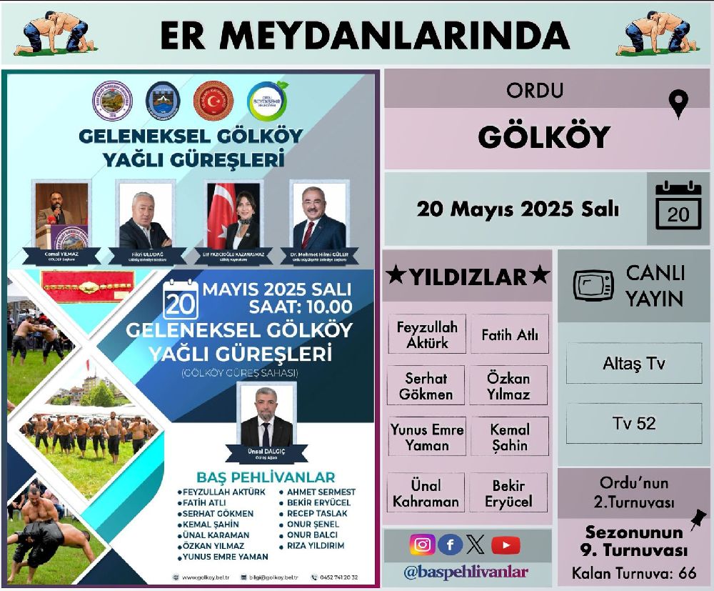 Ordu’nun Gölköy ilçesinde 20 Mayıs 2025 Salı günü gerçekleştirilen geleneksel yağlı güreşlerde, başpehlivanlık kürsüsüne Kemal Şahin çıktı. Türkiye’nin dört bir yanından çok sayıda başpehlivanın katıldığı organizasyon, hem rekabet düzeyi hem de izleyici ilgisiyle dikkat çekti.