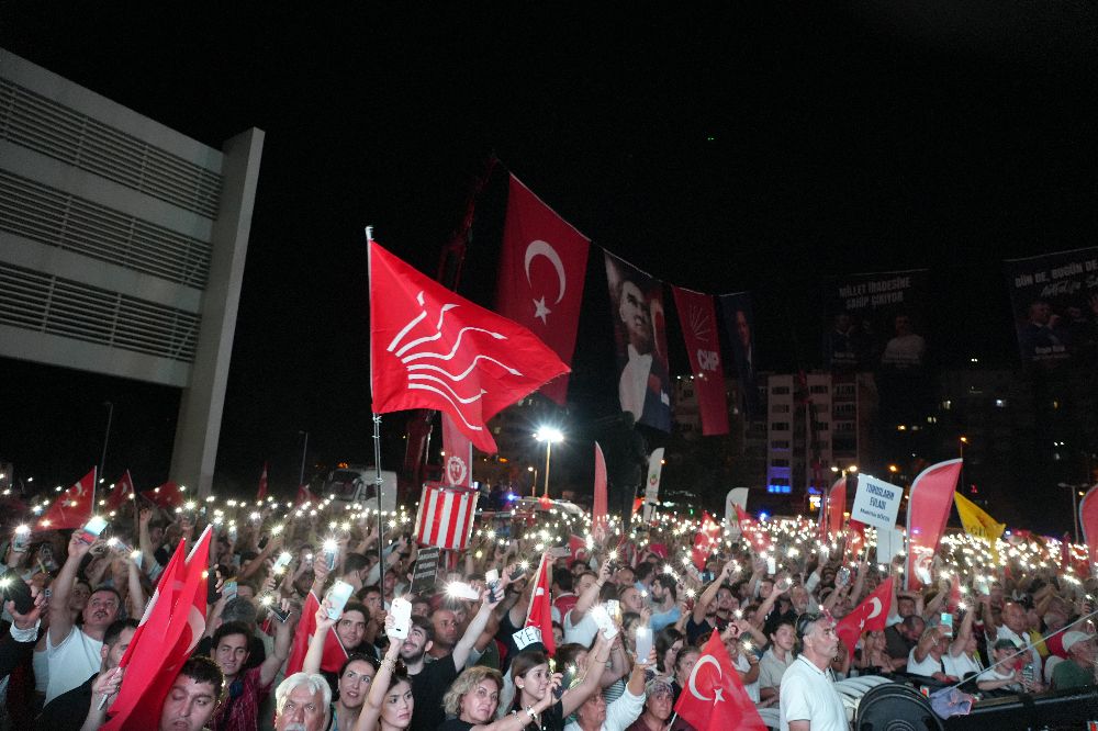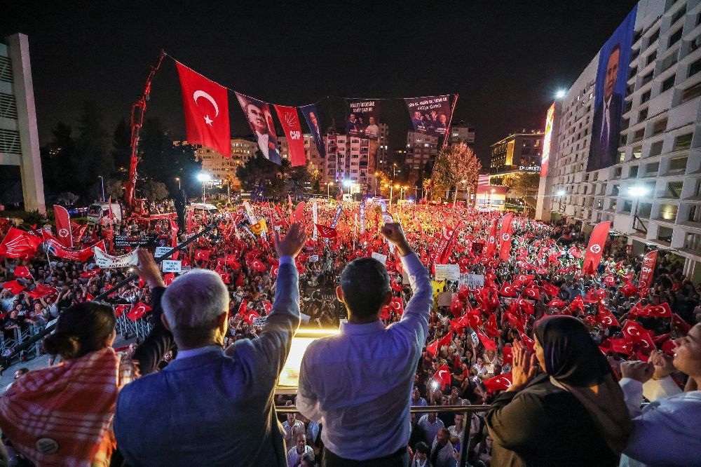 Belediye önündeki kalabalık, ellerinde Türk bayrakları ve parti flamalarıyla alanı doldurdu. Mitingde Özel'e, Büyükşehir Belediye Başkan Vekili Büşra Özdemir ile Başkan Böcek'in abisi ve yengesi de eşlik etti.