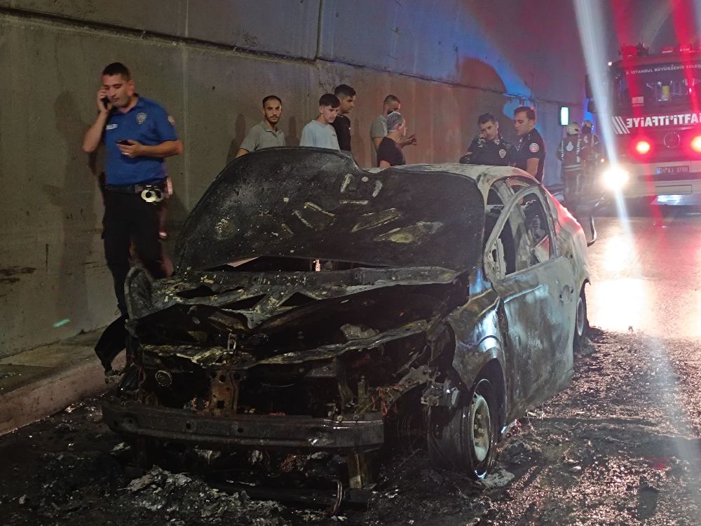 Pendik'te Sabiha Gökçen Havalimanı bağlantı tünelinde seyir halindeki bir otomobil alev alev yandı. Yangın nedeniyle tünelde trafik yoğunluğu oluşurken, otomobil kullanılmaz hale geldi.