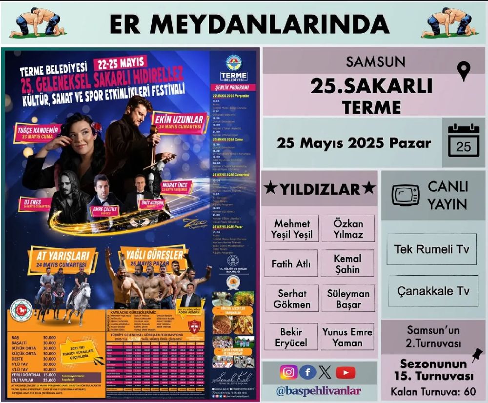Samsun’un Terme ilçesi bugün geleneksel sporumuz yağlı güreşe ev sahipliği yapıyor. Bu yıl 25. kez düzenlenen Sakarlı Yağlı Güreşleri, büyük bir katılım ve heyecanla başladı. Türkiye Geleneksel Güreş Federasyonu (TGGF) takvimine göre sezonun 15. organizasyonu olan güreşler, Karadeniz'de adeta bir güreş şölenine dönüştü.