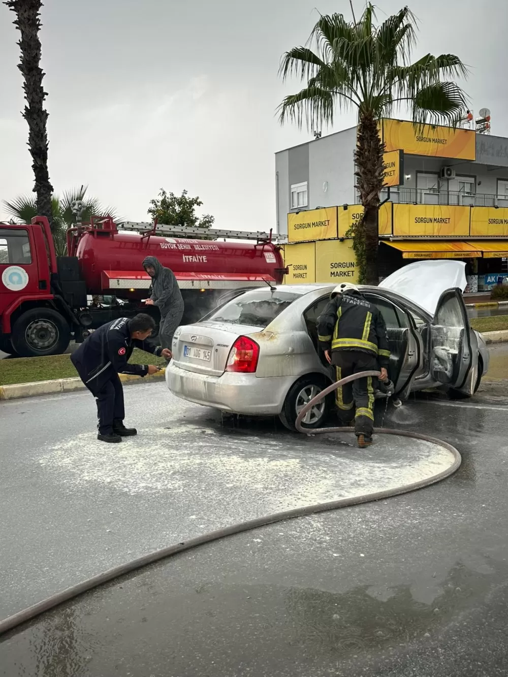 Olay, Manavgat ilçesi Sorgun Bulvarı'nda meydana geldi. Edinilen bilgiye göre, H.K., 01 ADG 145 plakalı Hyundaı otomobiline Sorgun Mahallesi Acısu Caddesi üzerinde bulunan akaryakıt istasyonundan yakıt aldıktan sonra, Sorgun Bulvarı'nda otogar istikametine seyir halindeyken otomobil bir anda yanmaya başladı. Araç sürücüsü kendisini araçtan dışarı atarken, yangına ilk müdahaleyi yol kenarında bulunan marketçiler tarafından yangın tüpüyle yapıldı. İhbar üzerine olay yerine gelen Antalya Büyükşehir Belediyesi İtfaiyesi Manavgat Birimi'ne bağlı ekipler, yangını tamamen söndürerek soğutma çalışması yaptı.
