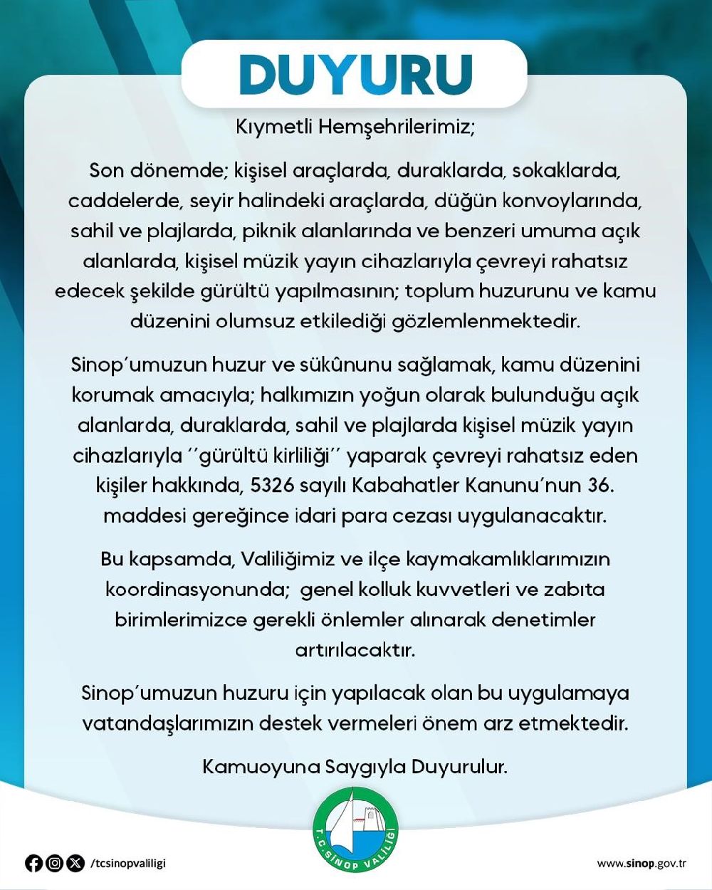 Valilik tarafından yapılan açıklamada, "Son dönemde; kişisel araçlarda, duraklarda, sokaklarda, caddelerde, seyir halindeki araçlarda, düğün konvoylarında, sahil ve plajlarda, piknik alanlarında ve benzeri umuma açık alanlarda, kişisel müzik yayın cihazlarıyla çevreyi rahatsız edecek şekilde gürültü yapılmasının; toplum huzurunu ve kamu düzenini olumsuz etkilediği gözlemlenmektedir. Sinop'umuzun huzur ve sükûnunu sağlamak, kamu düzenini korumak amacıyla; halkımızın yoğun olarak bulunduğu açık alanlarda, duraklarda, sahil ve plajlarda kişisel müzik yayın cihazlarıyla "gürültü kirliliği" yaparak çevreyi rahatsız eden kişiler hakkında, 5326 sayılı Kabahatler Kanunu'nun 36. maddesi gereğince idari para cezası uygulanacaktır. Bu kapsamda, Valiliğimiz ve ilçe kaymakamlıklarımızın koordinasyonunda; genel kolluk kuvvetleri ve zabıta birimlerimizce gerekli önlemler alınarak denetimler artırılacaktır. Sinop'umuzun huzuru için yapılacak olan bu uygulamaya vatandaşlarımızın destek vermeleri önem arz etmektedir" denildi.