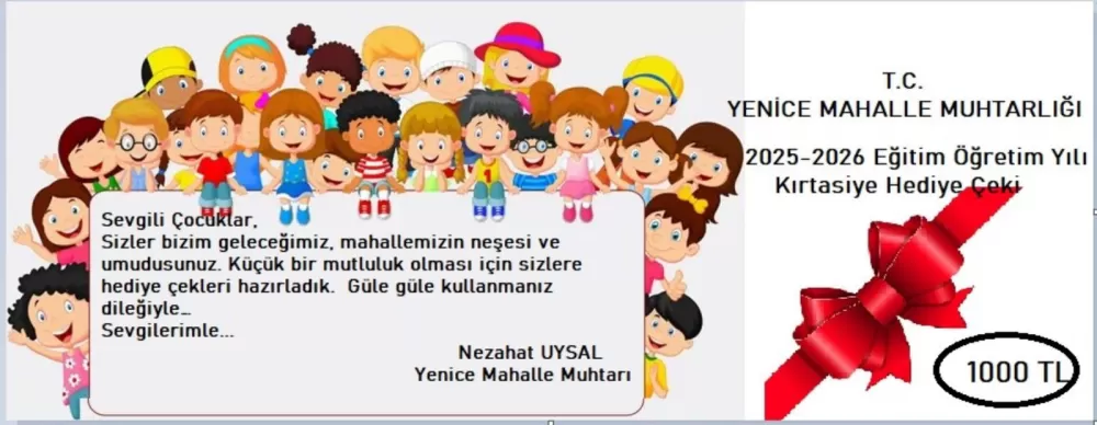 “Eğitim-öğretim yılının heyecanı hepimizi sardı. Öğrenci ve ailelerine bir nebze olsun destek olabilmek bizim için büyük bir mutluluk kaynağı. Yenice Mahallesi Muhtarlığı olarak çocuklarımızın eğitim yolculuğunda yanlarında olmayı sürdürüyoruz. Hediye çekleriyle, okulların açılışı sırasında karşılaşılacak masrafları hafifletmeyi amaçladık. Tüm ailelerimize hayırlı bir eğitim-öğretim yılı diliyor, çocuklarımıza başarı dolu bir yıl geçirmelerini temenni ediyoruz.”