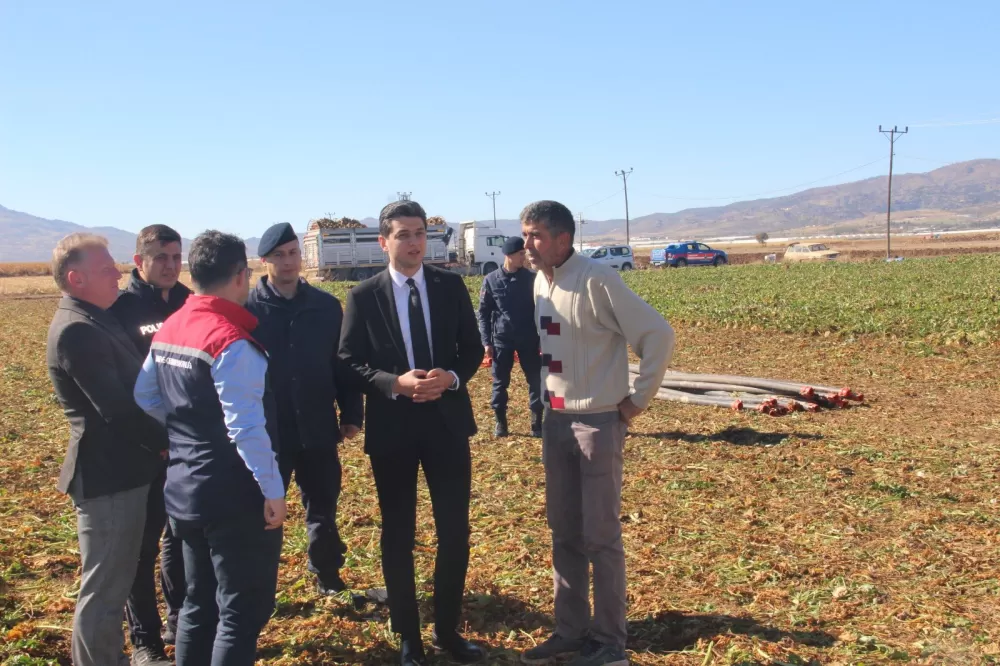 Tefenni Kaymakamı İbrahim Cem Deveci, beraberindeki heyetle birlikte hasat alanlarını ziyaret ederek üreticilerle bir araya geldi. Kaymakam Deveci’ye ziyarette Tefenni İlçe Tarım Müdürü Mehmet Çelik de eşlik etti. Çelik, bölgedeki üretim süreçleri ve pancar verimliliği hakkında detaylı bilgi verdi.