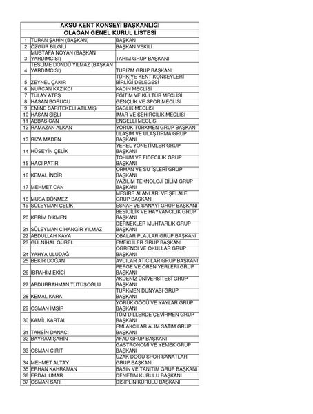 2024-2025 yılı faaliyet raporunun oy birliğiyle onaylandığı genel kurulda, Aksu'yu temsilen Türkiye Kent Konseyleri Birliği’ne delege olarak Zeynel Çakır görevlendirildi.