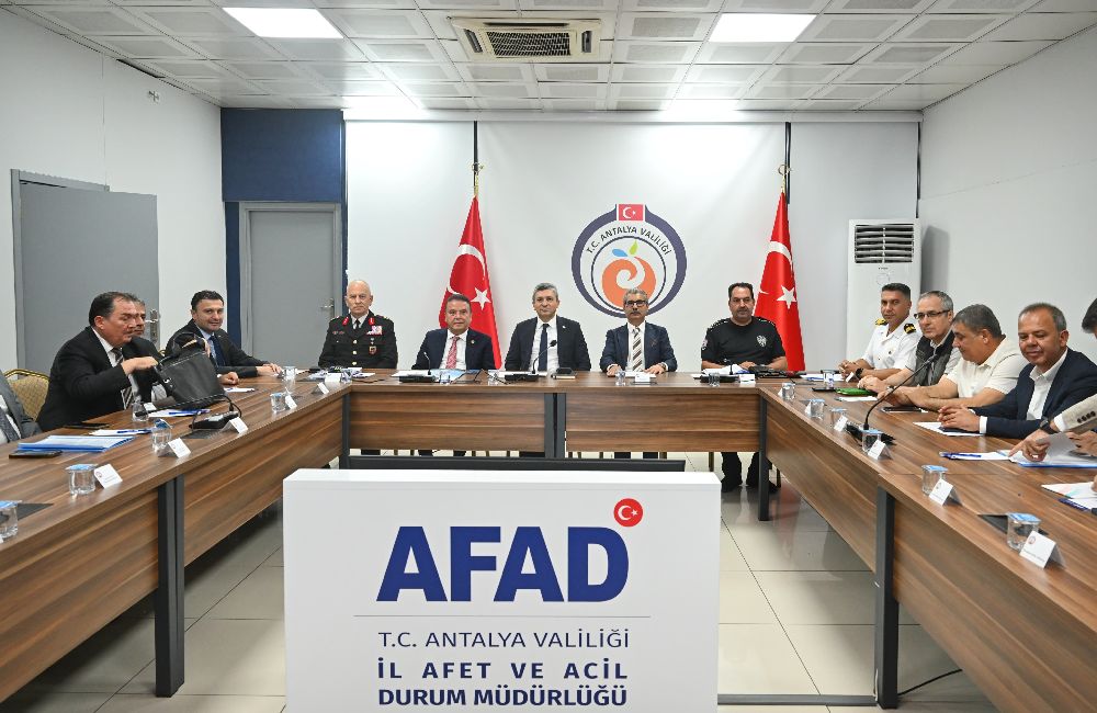 İl Afet ve Acil Durum Müdürlüğü (AFAD) Toplantı Salonu’nda düzenlenen toplantıya, Antalya Büyükşehir Belediye Başkanı Muhittin Böcek, İl Jandarma Komutanı Tuğgeneral Tarık Hekimoğlu, İl Emniyet Müdürü İlker Arslan, AFAD İl Müdürü Necmi Erçin, ilçe belediye başkanları, ilgili kamu kurum ve kuruluşlarının yöneticileri ile sivil toplum kuruluşlarının temsilcileri katıldı.
