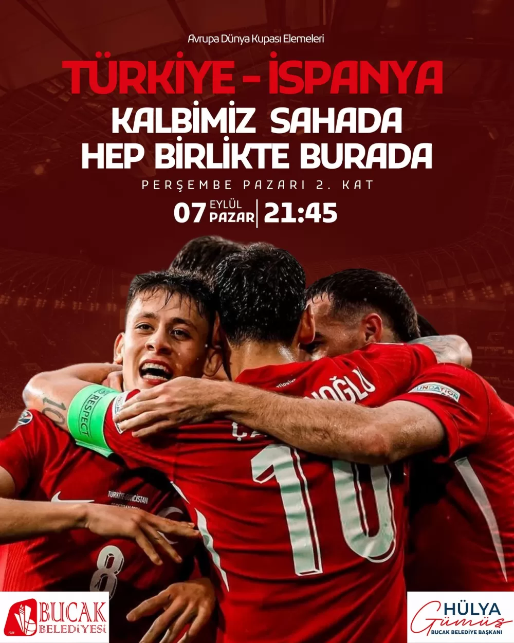 Karşılaşma için özel hazırlık yapan Bucak Belediyesi, Perşembe Pazarı 2. katında dev ekran kurulacağını duyurdu. Etkinlik, 7 Eylül Pazar günü saat 21.45’te başlayacak. Vatandaşlar, aileleri ve arkadaşlarıyla birlikte bu özel atmosferi ücretsiz olarak yaşayabilecek.