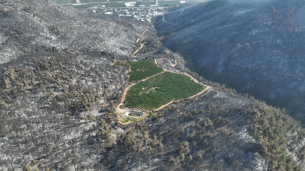 Hayatın normale dönmesiyle birlikte köylülerin geçim kaynağı olan tarım alanlarındaki bir bahçesi ise dikkat çekti. 100 hektarlık ormanlık alandaki ağaçların hepsi küle dönerken, ormanın içinde Karahıdır Mahallesinde kalan nektarın bahçesi yemyeşil üzerinde meyveleriyle kala kaldı. Dikkat çeken bahçenin çevresindeki toprağın bile griye tabakayla kaplanmışken, 2B çerçevesindeki Halil Kiraz'a ait 25 dönümlük arazinin etkilenmemesi büyük sevinçle karşılandı.
