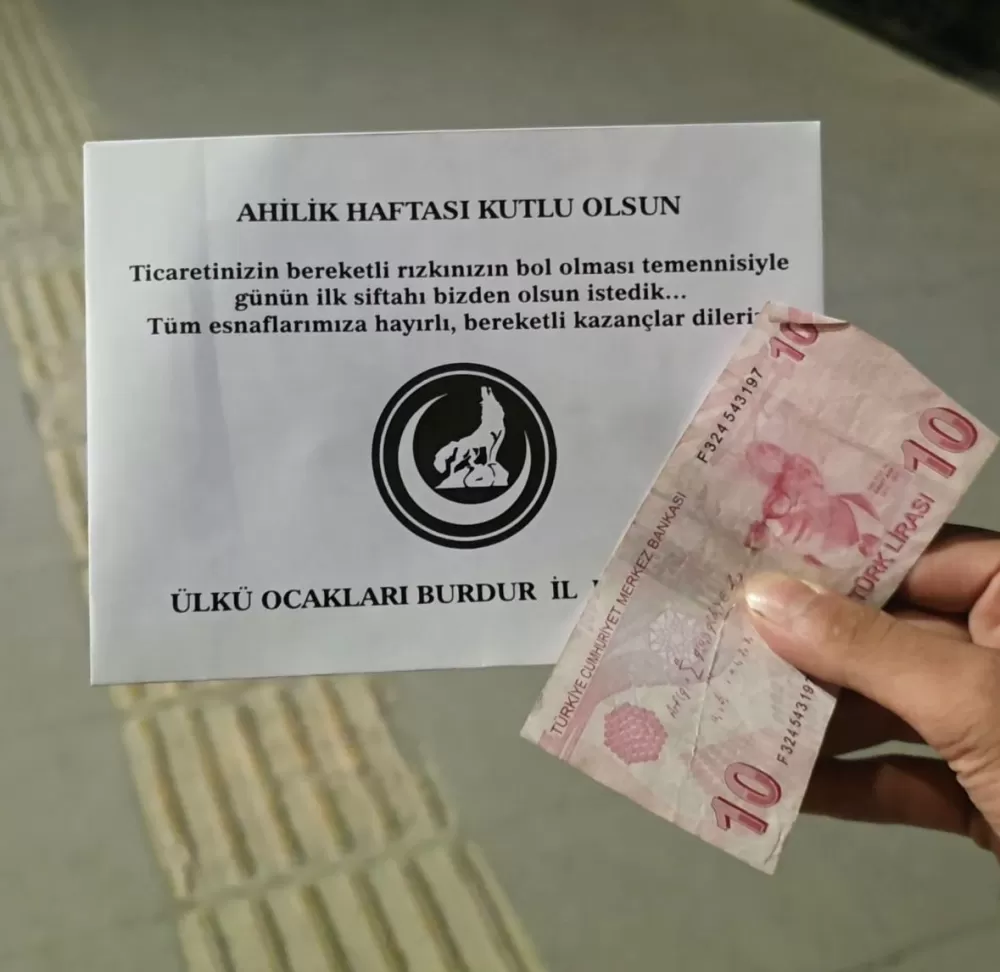 Ahilik Haftası kapsamında Burdur Ülkü Ocakları, yüzyıllardır süregelen kadim bir geleneği yaşatmak için dikkat çeken bir etkinliğe imza attı. Akşam saatlerinde kent merkezindeki esnafların kapısına “günün ilk siftahı” olarak sembolik zarflar bırakan Ülkü Ocakları üyeleri, esnafa bereketli kazançlar diledi.