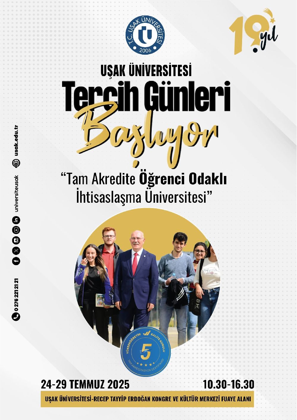 Uşak Üniversitesi, Yükseköğretim Kurumları Sınavı (YKS) sonuçlarının açıklanmasının ardından, üniversite tercih sürecindeki aday öğrenciler için 24-29 Temmuz 2025 tarihlerinde, 10.30-16.00 saatleri arasında aday öğrenciler için ‘Tercih Günleri’ düzenleyecek." Etkinlik, Uşak Üniversitesi Bir Eylül Yerleşkesinde yer alan Recep Tayyip Erdoğan Kongre ve Kültür Merkezi Fuaye alanında gerçekleştirilecek.