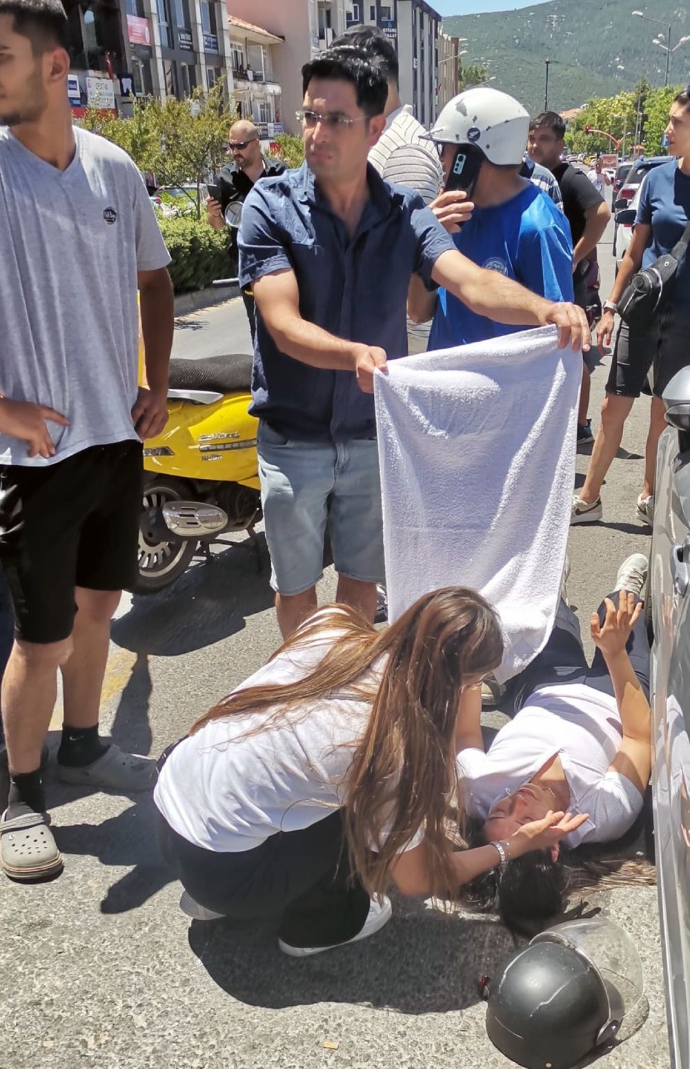 Muğla’nın Menteşe ilçesinde meydana gelen trafik kazasında yaralanan kadın motosiklet sürücüsü, çevredeki vatandaşlar tarafından sıcaktan korunması için havlu ile gölgelendi.