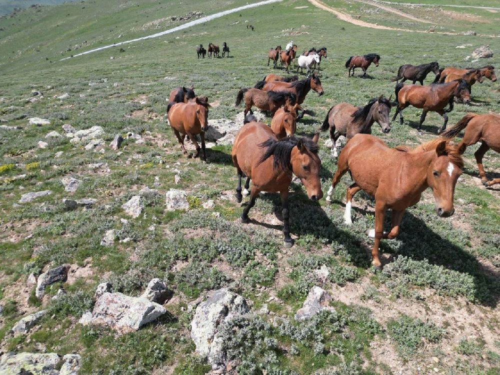 Sevimlilikleri ve ürkeklikleri ile bilinen yılkı atları yaz mevsimin gelmesi ile yaylardan aşağı inmeye başlarken, atların sürülerin halinde gezdiği anlar ise dron kameralarına yansıdı.